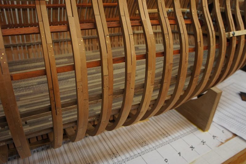 Afgelopen week heb ik alle spanten, ook die niet naar mijn zin waren, gerepareerd en/of aangepast. De volgende stap is de balkwegers van de diverse dekken aan te brengen. Dit zijn de zijbalken waar de dekbalken van het dek op komen te liggen. Dit betekent dat de balkwegers voor het Lowerdeck tot en met het Quarterdeck geplaatst worden in de romp.