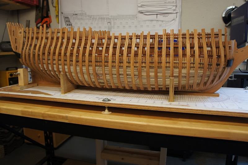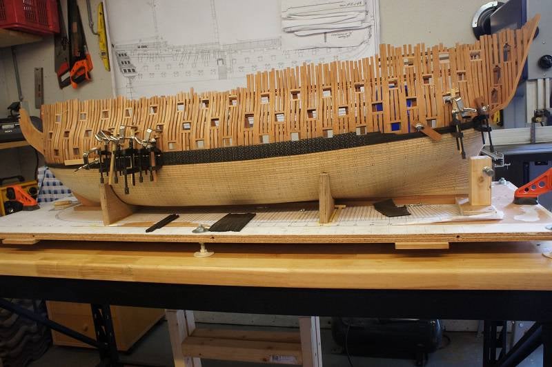 Intussen dus maar het onderste berghout afbouwen. Nu is het werken met Ebbenhout weer nieuw voor mij en ik heb weer de nodige leermomenten gehad. Het hout is zeer hard en het buigen kost veel meer tijd dan gedacht. De planken van het berghout zijn zo'n 6 mm dik en om deze goed te kunnen buigen week ik ze eerst 24 uur in water en laat ik ze daarna zeker 3 tot 3,5 uur stomen.