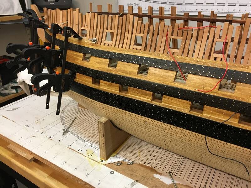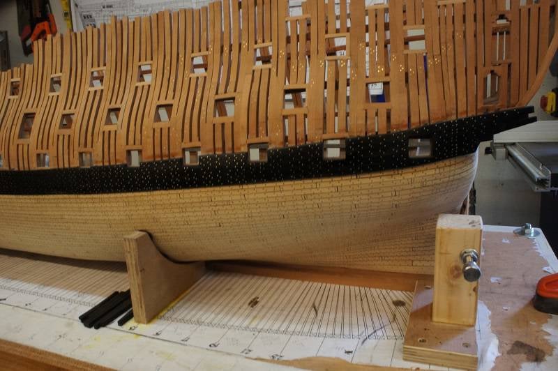 Een paar jaar geleden hebben we een flinke discussie gevoerd op een forum over hoe de 'Gun Ports' aansluiten op de beplanking van de romp. Ik volg hier de tekeningen van John MCKay en die is hetzelfde zoals we destijds in de discussie concludeerden. De 'Gun Ports' worden dus later nog eens voorzien van een plank die over de beplanking van de romp heen gaat.