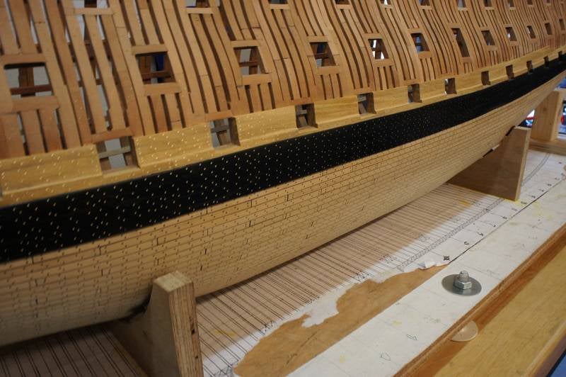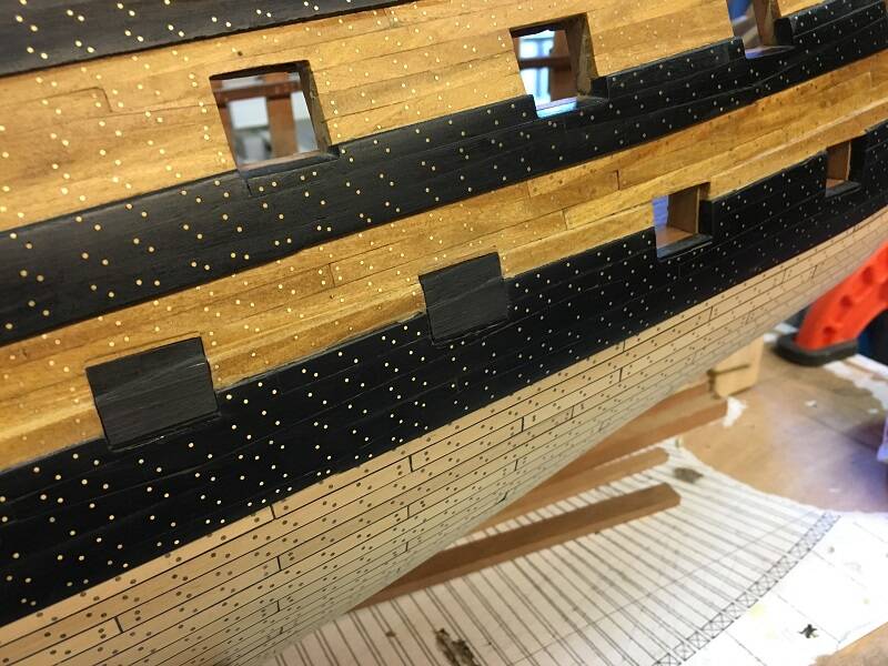 Het is de bedoeling dat de kanonnen door de geschutspoorten heen steken, ik wil de z.g. gevechtspositie uitbeelden. Daardoor komen de luiken van de Gun Ports in een geopende stand te staan en eigenlijk zijn ze dan het kwetsbaarst. De buitenzijde is nog niet geheel af en ik wil zo min mogelijk boven de luiken werken. Er valt wel eens wat naar beneden en je zal zien dat dit dan altijd op een luik valt, waardoor deze er zeker van af zal breken.