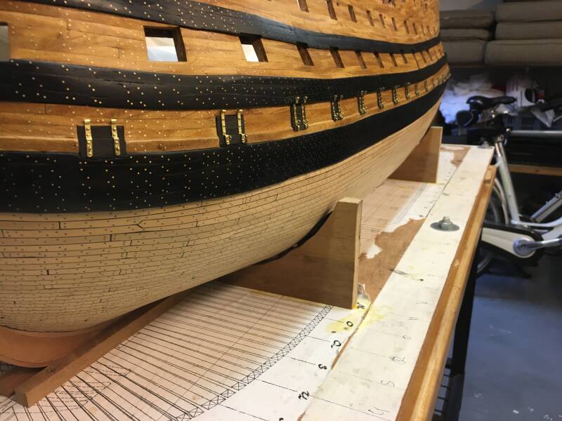 De kleppen worden stuk voor stuk passen gemaakt op iedere geschutspoort. Omdat de berghouten dwars over de geschutspoorten heen lopen start ik met een dikke klep die geheel in de juiste vorm wordt gefreesd en geschuurd. Op deze wijze lopen de berghouten door in de poortkleppen. Daarnaast moeten de kleppen aan de binnenzijde goed aansluiten aan de sponningen. Ik ben inmiddels op de helft van de poortkleppen v.w.b. het Lower Deck. Nog 8 te gaan en intussen ga ik starten met de scharnieren van de kleppen.