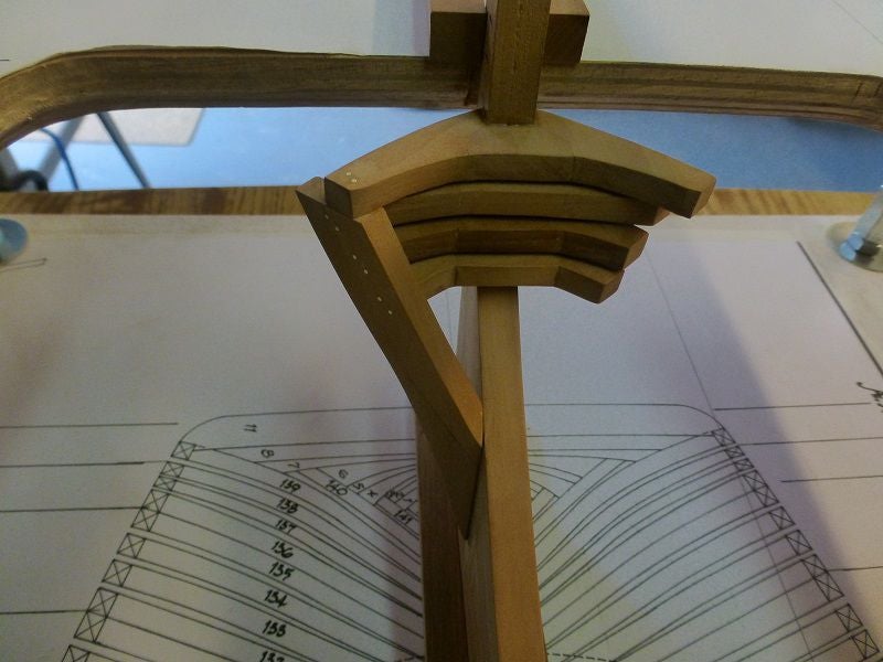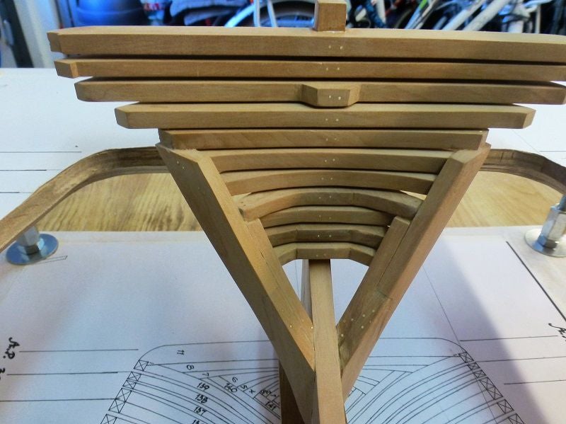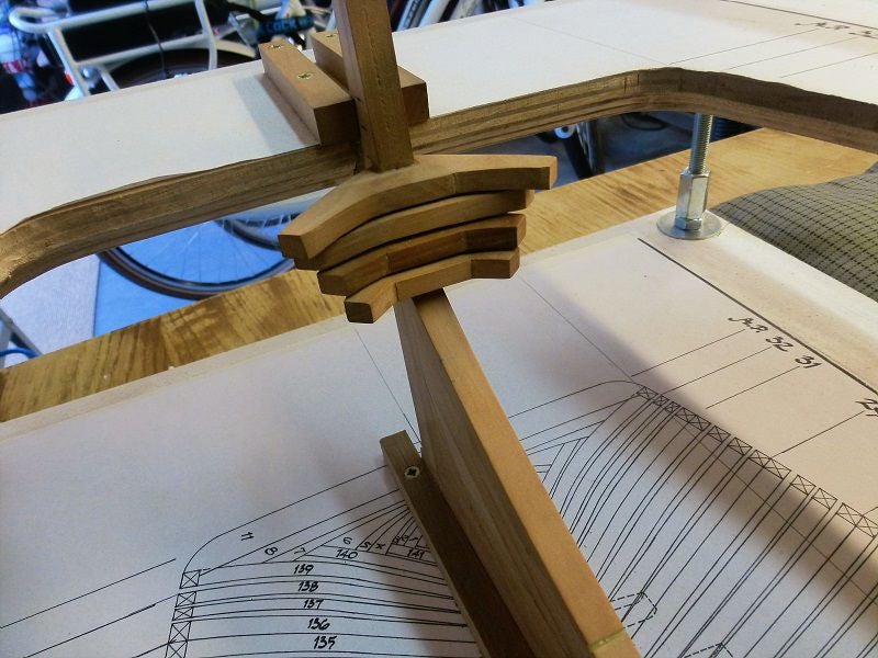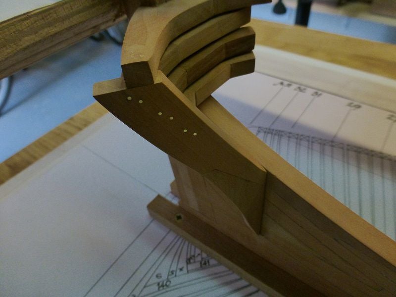 De spanten 140 zitten ook in al elkaar en zijn voorzien van messing pennen. Morgen ga ik ze op maat maken en dan plaatsen.