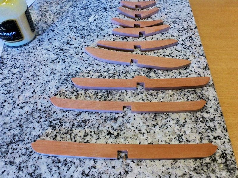 Het liep dus even anders dan gedacht! Normaal maak ik 4 spanten tegelijk, echter deze manier van werken heb ik nu echt los moeten laten. De 4 geproduceerde spanten in de afgelopen week waren totaal niet naar mijn zin en heb ik dus weggegooid. Ik bouw dus vanaf nu, net als bij de boeg, spant voor spant op naar het achtersteven.