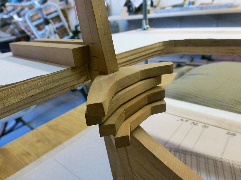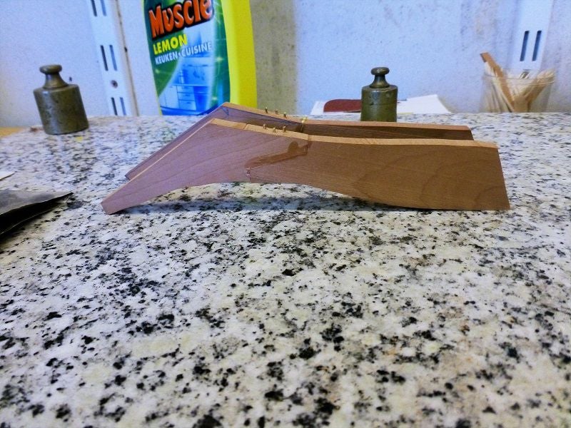Daarnaast sluit spant 141 ook nog eens schuin aan tegen de kiel. Ik heb het proefstuk iets groter nagemaakt in Perenhout, zodat deze aan alle kanten nog afgeschuurd kan worden.