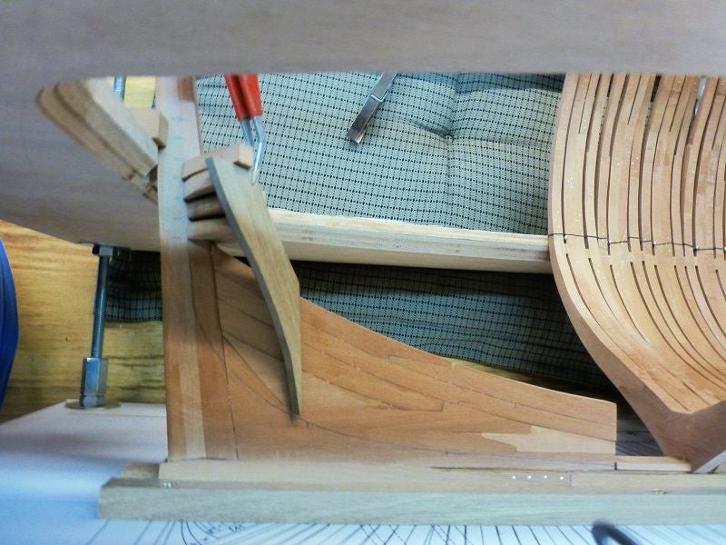 Het volgende is namelijk aan de hand.... Voor de boeg heb ik destijds besloten om vanaf spant 10, naar de scheg toe, beide zijden dicht te bouwen. Je kunt dan schuin naar voren in de boeg kijken en daardoor kan ik de 'Luizenplecht', enz. geheel afbouwen. Dezelfde discussie speelt nu ook aan de achterzijde. Ik moet nu onderhand beslissen wat ik laat zien en vanaf welk punt je schuin naar binnen/achteren kunt kijken en een mooi beeld blijft hebben.