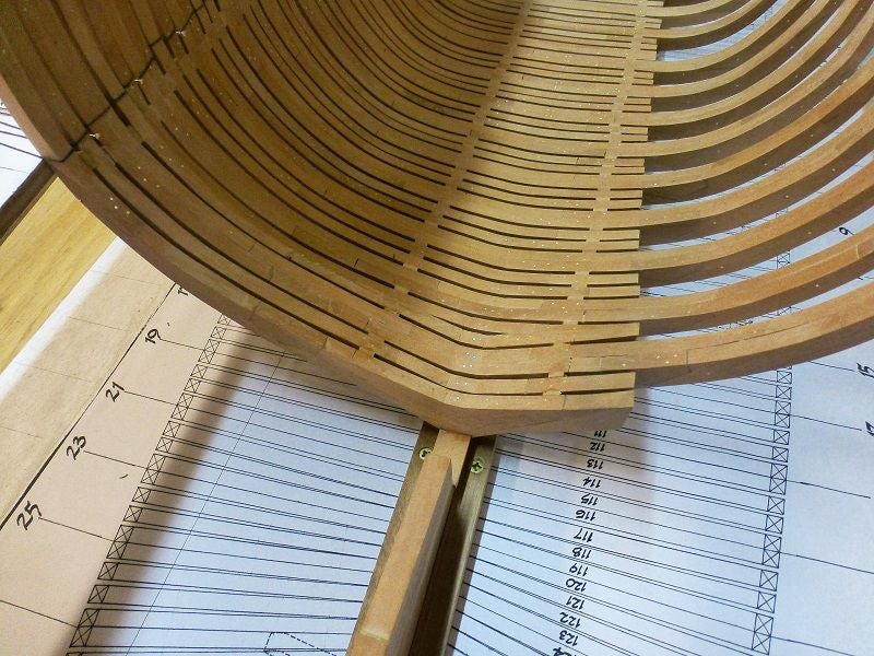 De onderste delen van spant 140 t/m 145 zijn tegen de kiel geplaatst. Ik ben zeer tevreden met het resultaat, zeker omdat alles nu klopt.