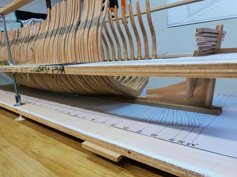 Spant 115 en 116 zijn gereed en vandaag op de kiel geplaatst. Er is net genoeg ruimte om spant 117 nog op de kiel te plaatsen. Vanaf deze spant worden de spanten tegen de kiel geplaatst. Spant 115 en 116 zijn ook wat hoger dan de voorgaande spanten, deze verhoging is nodig vanwege het 'Poopdeck'.