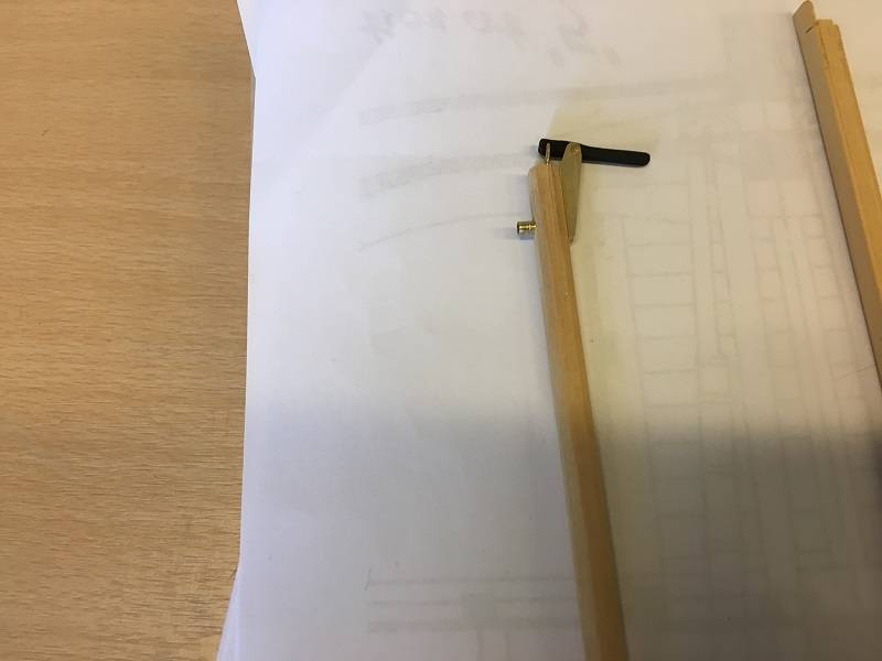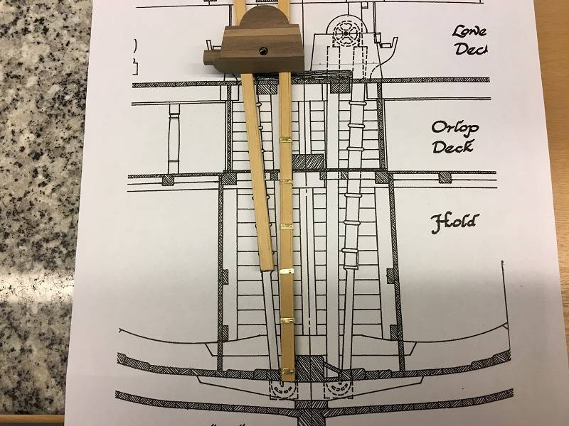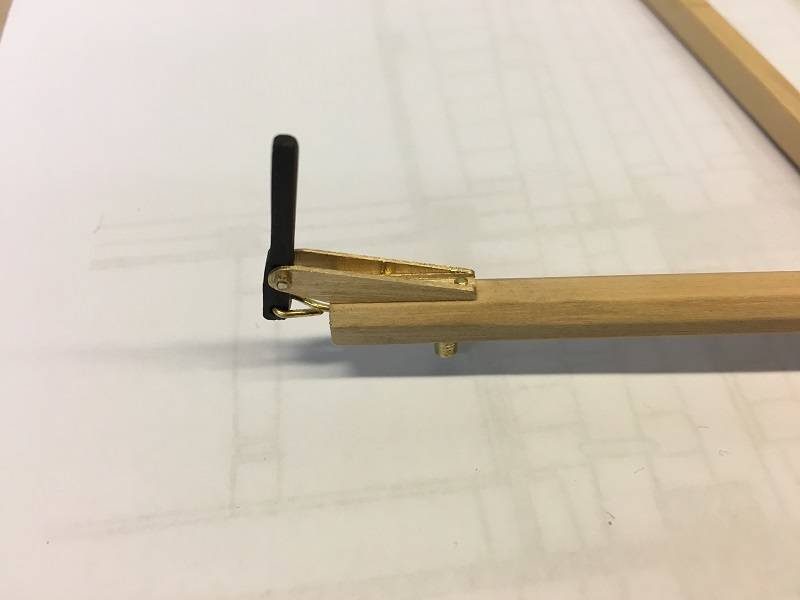 Naast de 4 Chainpumps komt op het Lowerdeck nog een Elm Tree Pump te staan. Het scharnier, enz., heb ik van messing vervaardigd en met pennen bevestigd.