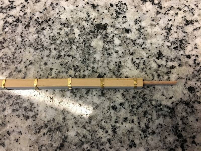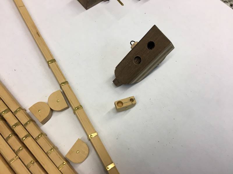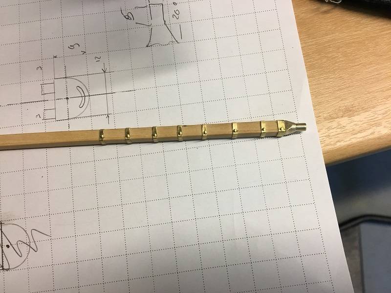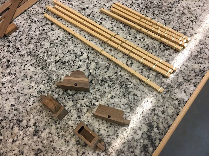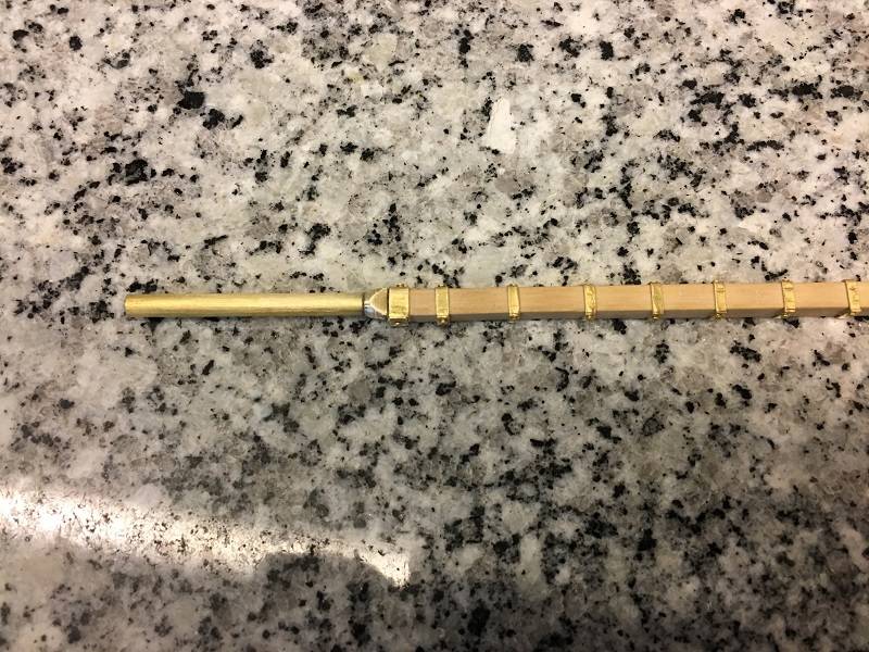 Als eerste heb ik alle houten buizen in elkaar gezet, geschuurd en daarna voorzien van messing banden. Het is onmogelijk de banden om de buizen op deze schaal 100% na te maken, maar ik wil wel laten zien dat de buizen door deze banden bij elkaar gehouden worden. De messing banden zijn, zonder gebruik van lijm, om de buizen gespannen en zitten met 2 koperen spijkertjes vast.