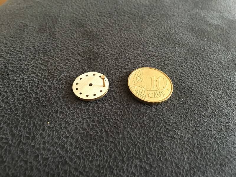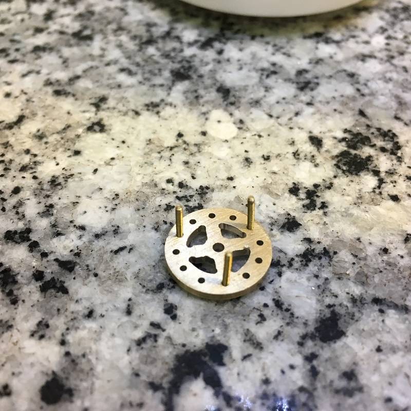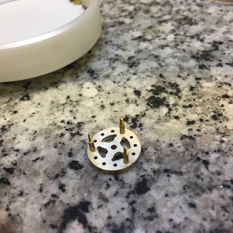 Ik heb dus 4 messing schijven gedraaid die 1,2 mm dik zijn en deze voorzien van de benodigde gaten en uitsparingen. Tussen de schijven zitten afstandsbussen en de schijven worden met elkaar verbonden met pennen. Ik heb hiervoor boutjes gebruikt van M1.