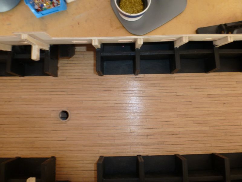 De handleiding geeft aan dat eerst de houten delen met geschutspoorten pas gemaakt moeten worden met het 2- en achterdek. Er wordt zodoende van boven naar beneden gewerkt.