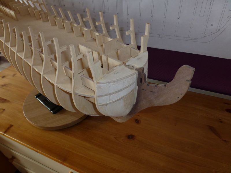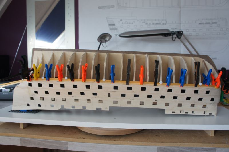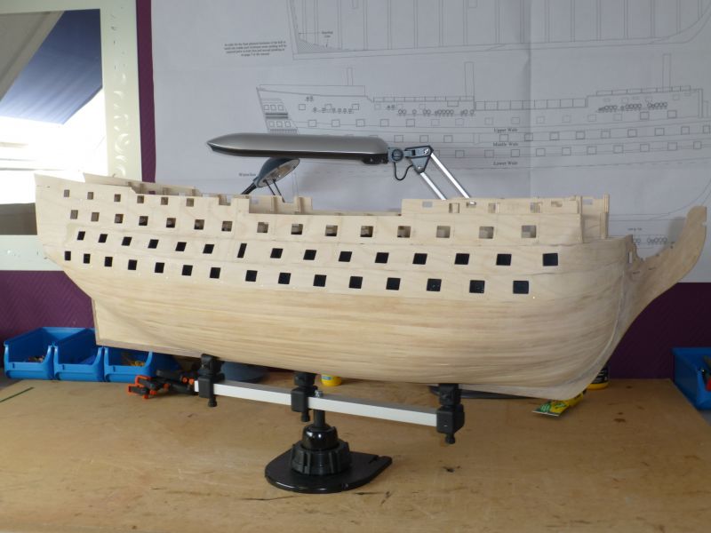 Na het zwart schilderen ben ik de afgelopen periode bezig geweest de zijschotten te plaatsen. In de tussentijd ook maar even een draaitafel gemaakt, waarop ik het schip ondersteboven kan gaan beplanken.