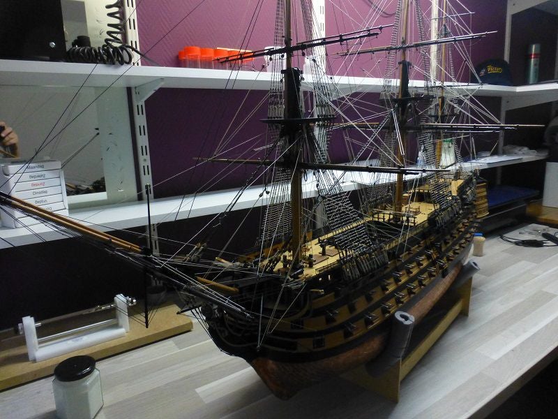 Afgelopen week het schip maar eens flink afgestoft. Ik ben wel een beetje geschrokken over de hoeveelheid stof dat zo'n model aan trekt. Dan heb ik het nog niet eens over de spinnenwebben in de tuigage. De vitrine is dus een must.