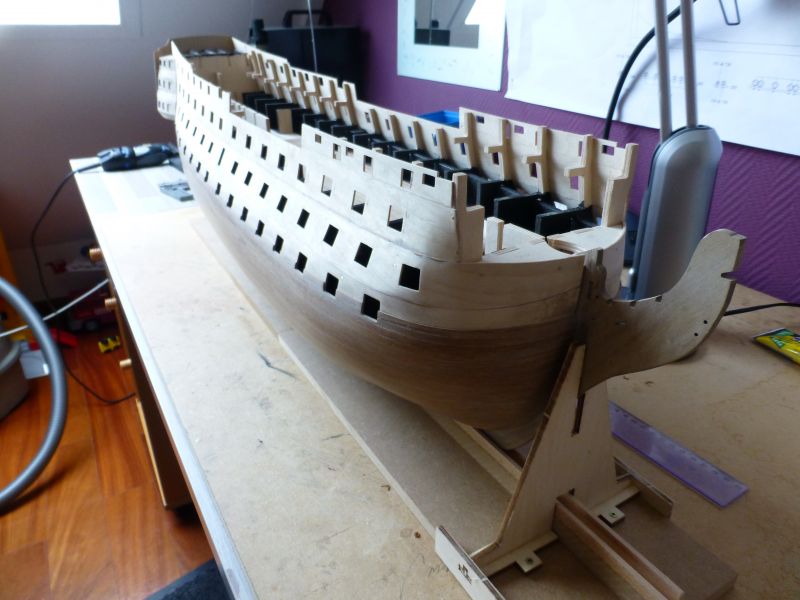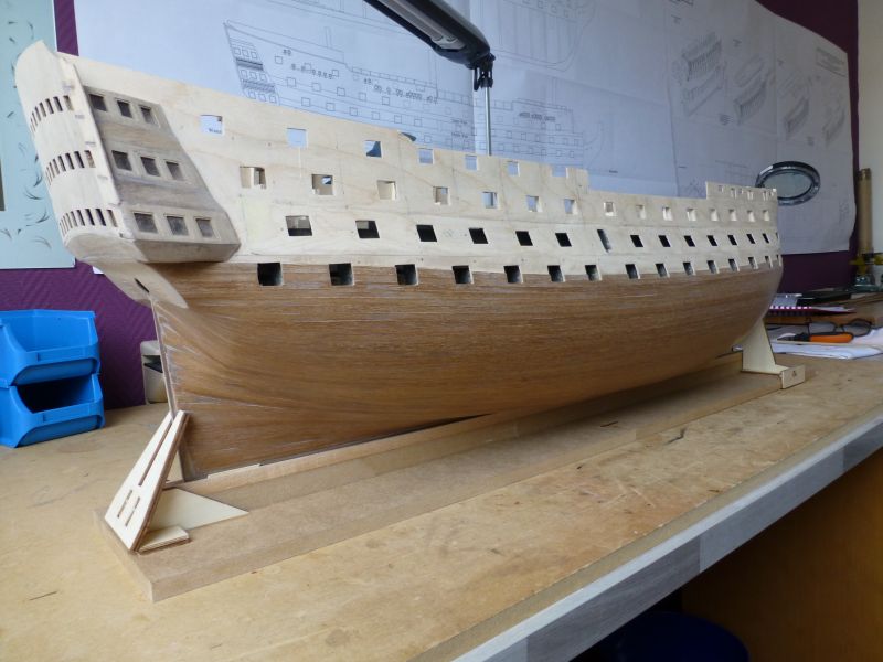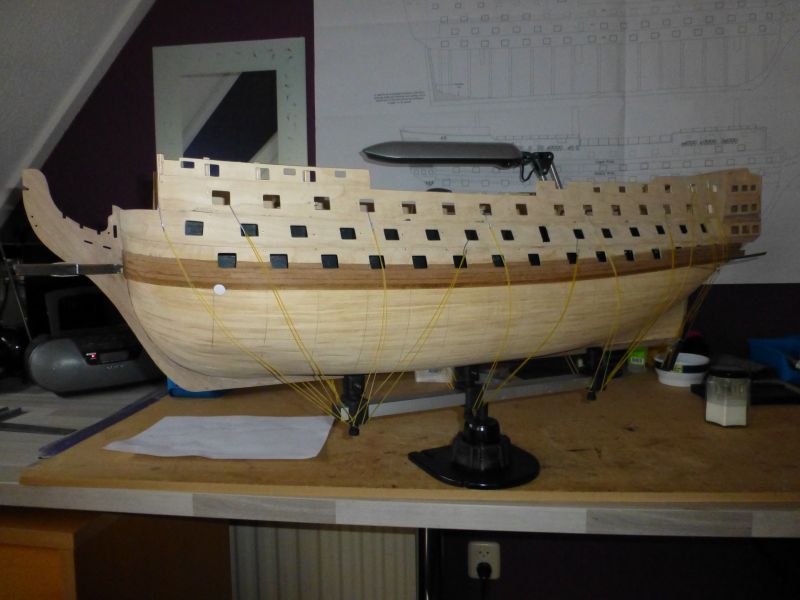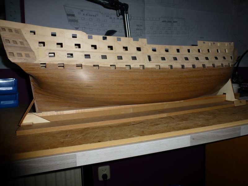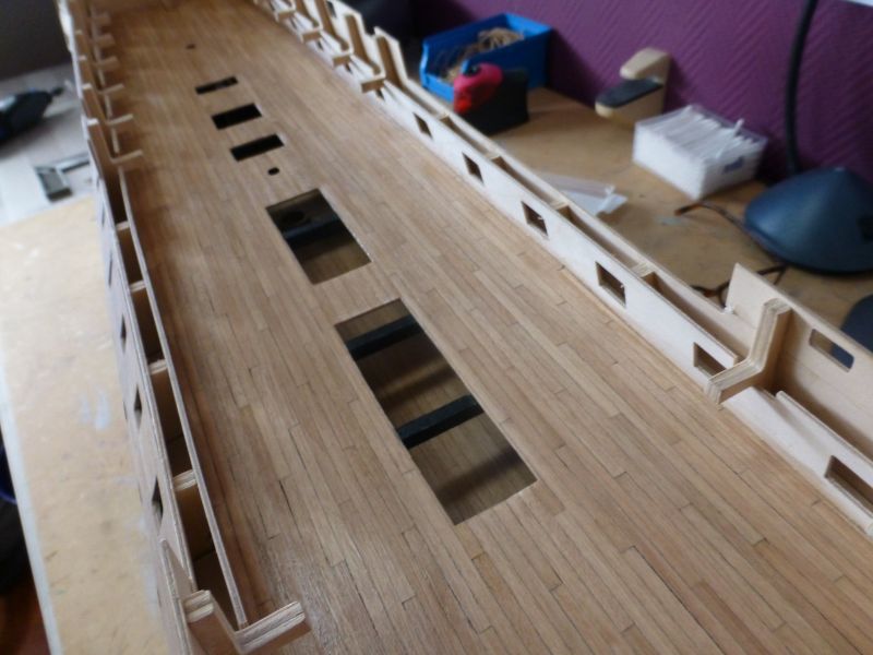 Gisteren en vandaag alles geschuurd en in de lak gezet. Vandaag starten met het afwerken van een aantal geschutspoorten. Daarna de binnenzijde en buitenzijde verder beplanken.