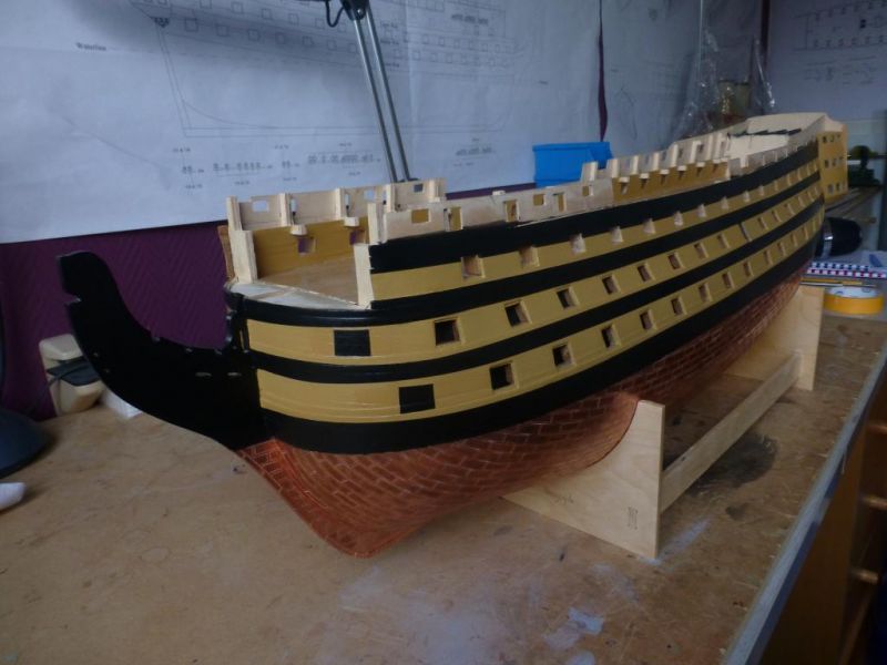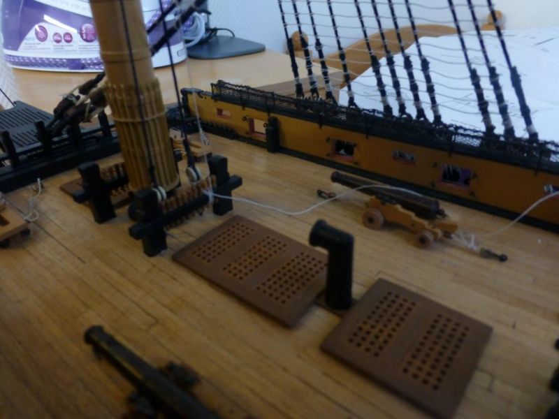 Als ik in het boek 'The anatomy of Nelson's ships' kijk dan zouden ze, van de boeg gerekend, op de 2e t/m 6e hoofdlijn van de voorste mast moeten zitten. Dit zijn er dus 12. En op de 1e t/m 5 hoofdlijn van de achterste mast. Dan zouden er op de hoofdlijnen van de hoofdmast geen shroud cleats komen.