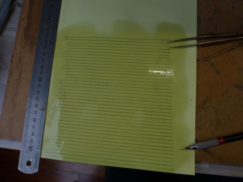 Nu had ik de tip gekregen om geen wit papier te gebruiken, geel papier is wat rustiger. Dus lijnen getrokken op geel papier en flink in de haarlak( van mijn dochter gepikt) gezet. Op deze manier gaan de potloodlijnen niet vegen en wordt het papier wat harder.