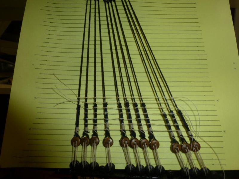 Eindelijk zitten de ratlines er op bij de onderste wanden. genoeg tijd gehad om even te tellen. Bijna 2000 knopen. Ik blijf bij mijn standpunt... een K klus