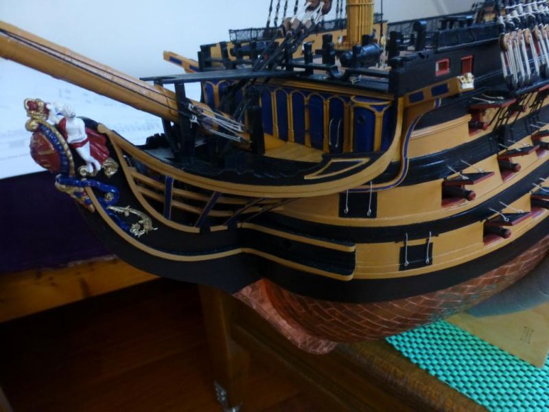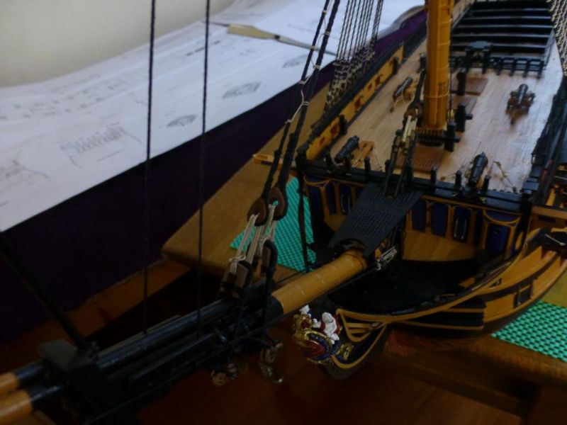 Het vastzetten van de boegspriet met touw wordt anders aangegeven door Caldercraft, dan dat de boeken aangeven. Het is nu bijna niet meer te zien, maar de slagen zijn conform de boeken aangebracht. Direct ook een voorbeeldje van iets waar Gil het anders heeft gedaan. De stays moeten aan de knightheads vastgezet worden met rigging blocks. Gil heeft dit op een eigen manier ingevuld