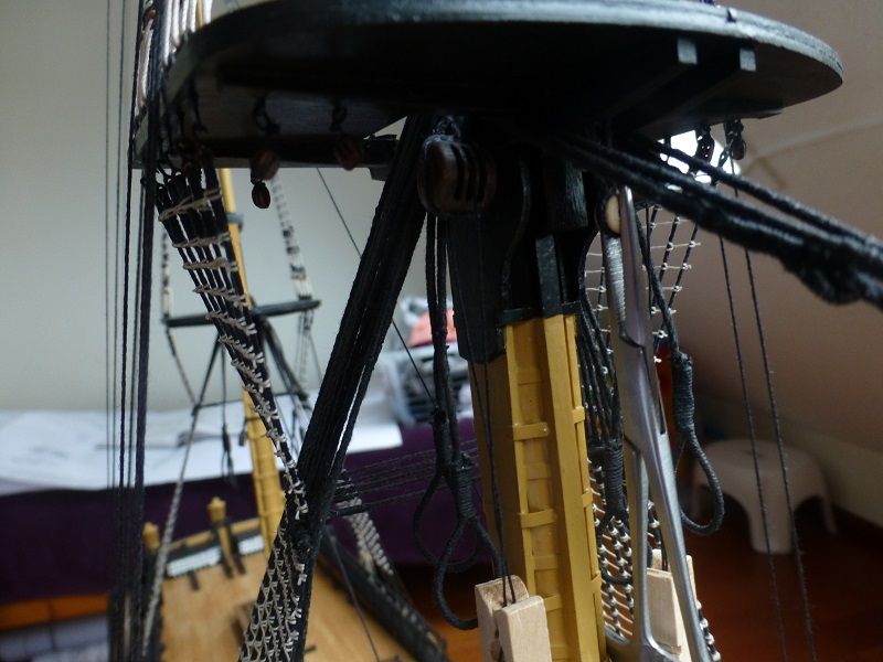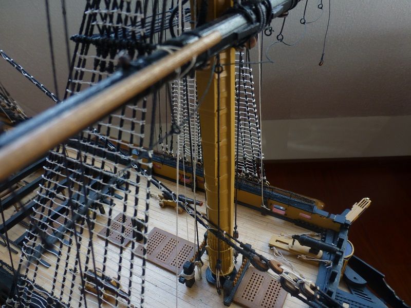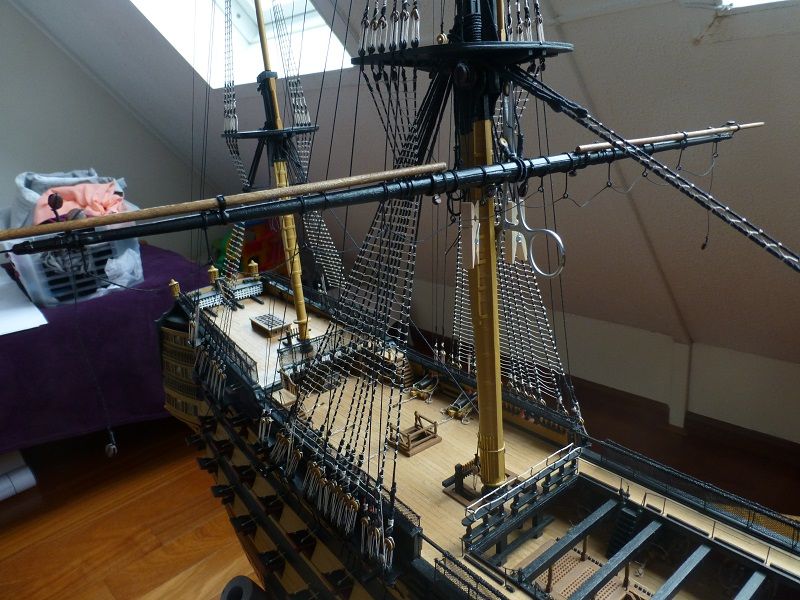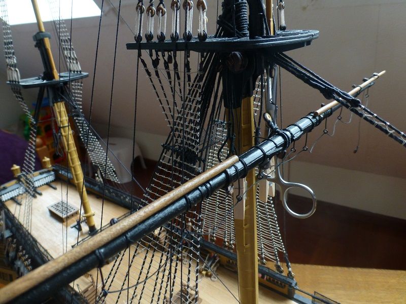 Afgelopen weken bezig geweest om de grote ra van de hoofdmast gereed te maken en alle ophangpunten voor deze ra voor te bereiden. Ik wijk hier compleet af van de bouwhandleiding. Inmiddels heb ik de tuigage wel helemaal door en ik werk ook met afwijkende katrolblokken. De katrolblokken, die in de kit zijn meegeleverd, vind ik te vierkant en zijn niet mooi. Vrijdag kwam de laatste lading blokken uit Polen binnen en zodoende kon ik eidelijk de eerste ra ophangen. Vanmorgen de ra officieel in de hoofdmast gehangen en hem recht gezet door de `Cross Jack Lifts´ te monteren. Dit is de tuigage die van de punten van de ra´s via de mast naar beneden naar het wand loopt.
