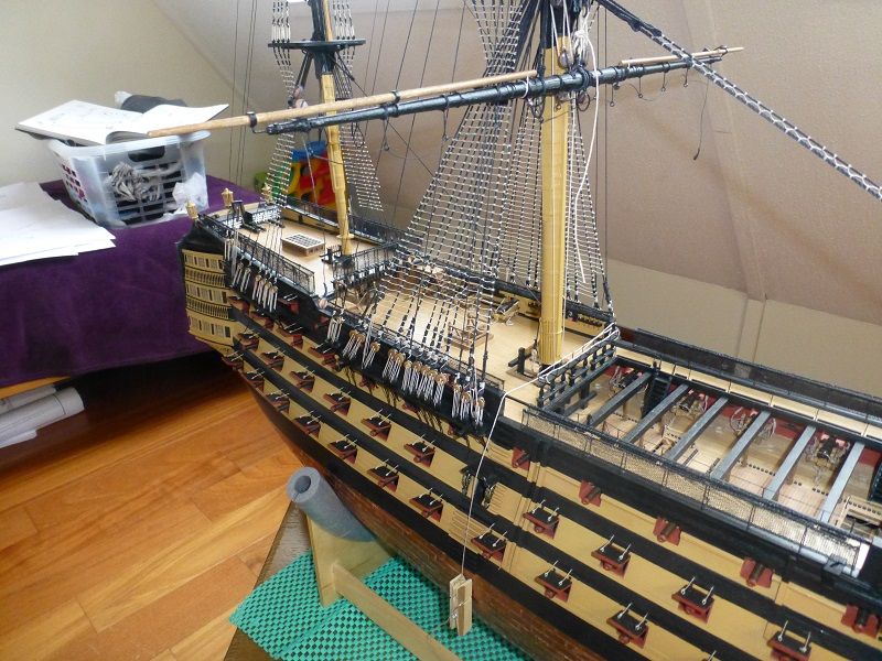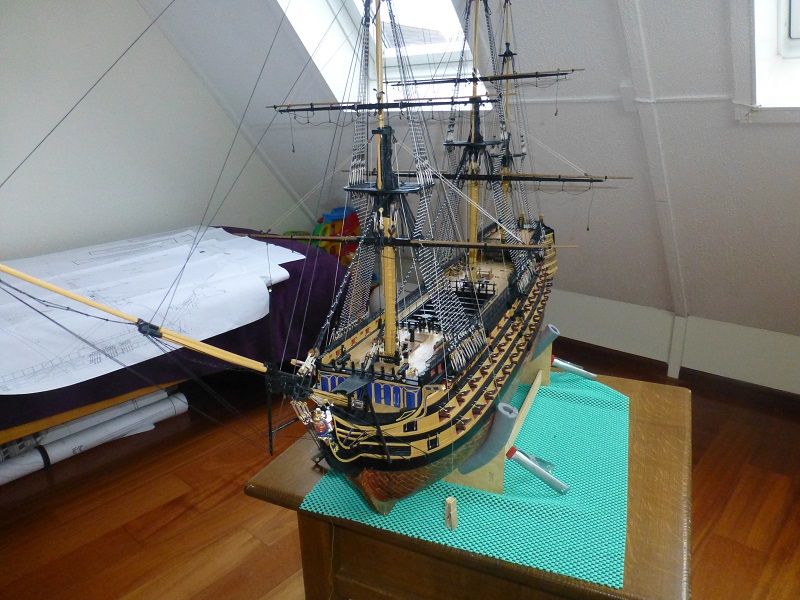 Na zondag alles weer opgeruimd te hebben, weer even gewerkt aan de Vic 1:72. Heb de grote ra van de hoofdmast voorzien van alle blokken, looppaarden, enz. Alles nog een keer geschilderd en deze is bijna gereed om aan de mast gehangen te worden.