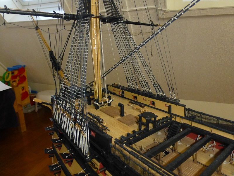 Probleem bij deze 'Truss pendants' was dat je deze deels samen kunt stellen op je werkblad. Er moet ook flink wat gevlochten worden tussen de masten en de andere tuigage. Ik moet dan ook eerlijk toegeven dat ik een paar keer bewust weggelopen ben van mijn werkplek., maar ze zitten er nu gelukkig eindelijk op.