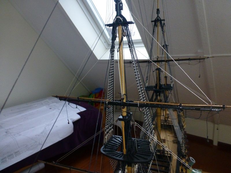 Vandaag de middelste ra's in de voor- en hoofdmast gehangen. Gaat nog flink wat tuigagewerk opleveren. Ook hier wijk ik af van de bouwbeschrijving omdat ik zoveel mogelijk tuigage al wil gaan aanbrengen. Ik kan er nu namelijk nog eenvoudig bij. Alhoewel ik mij nu soms ook in gekke bochten moet wringen.