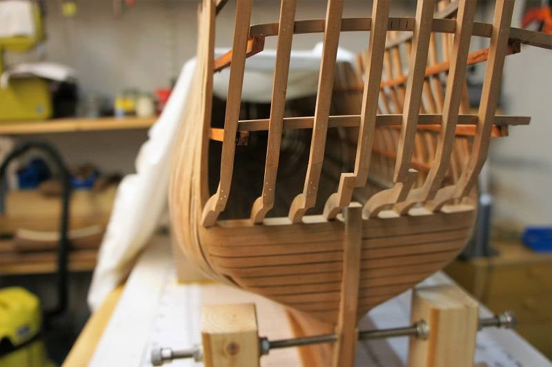 Door de voortgang verdwijnen de tijdelijke klemlatten. Ik verwijder steeds een klein gedeelte zodat de romp goed in vorm blijft.