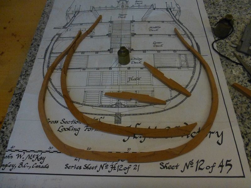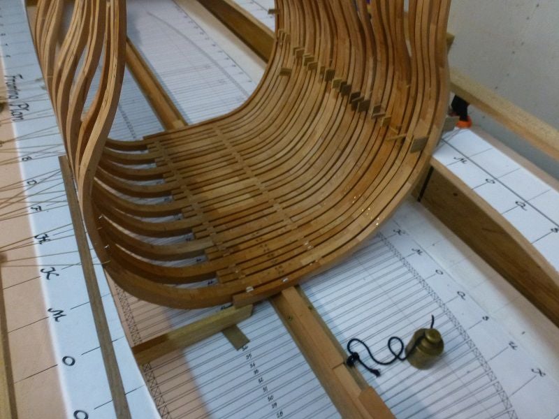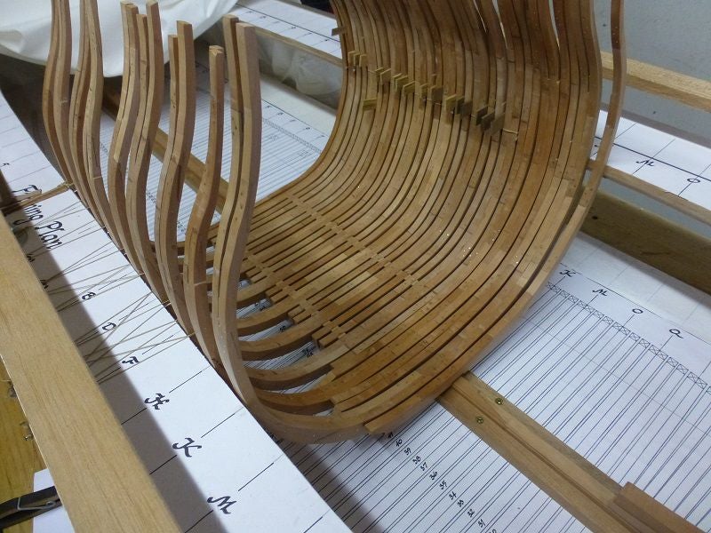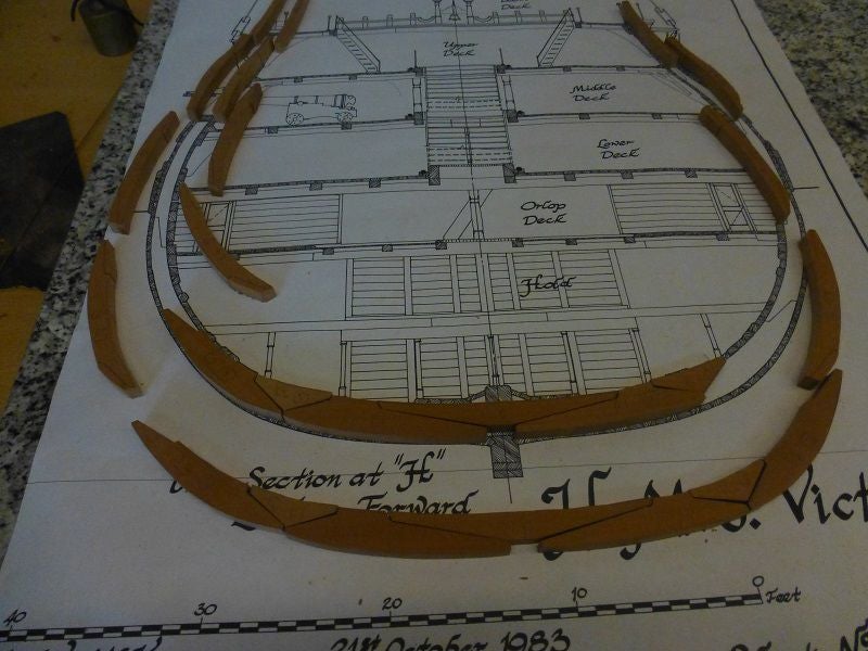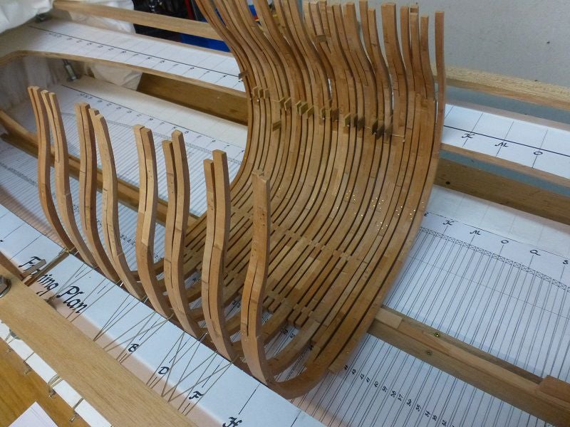 De spanten van sectie H (44 t/m 47) zijn gereed. Gisterenavond de laatste hand er aan gelegd en los op de kiel gezet. Betreffende de spanten heb ik nu 32 van de 149 spanten af. Hoewel er nog een hoop werk is te doen, blijft het onwijs leuk.