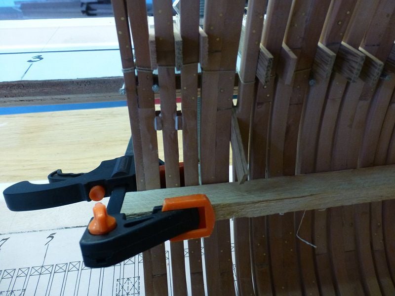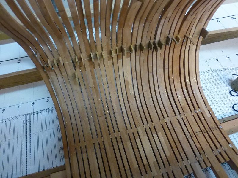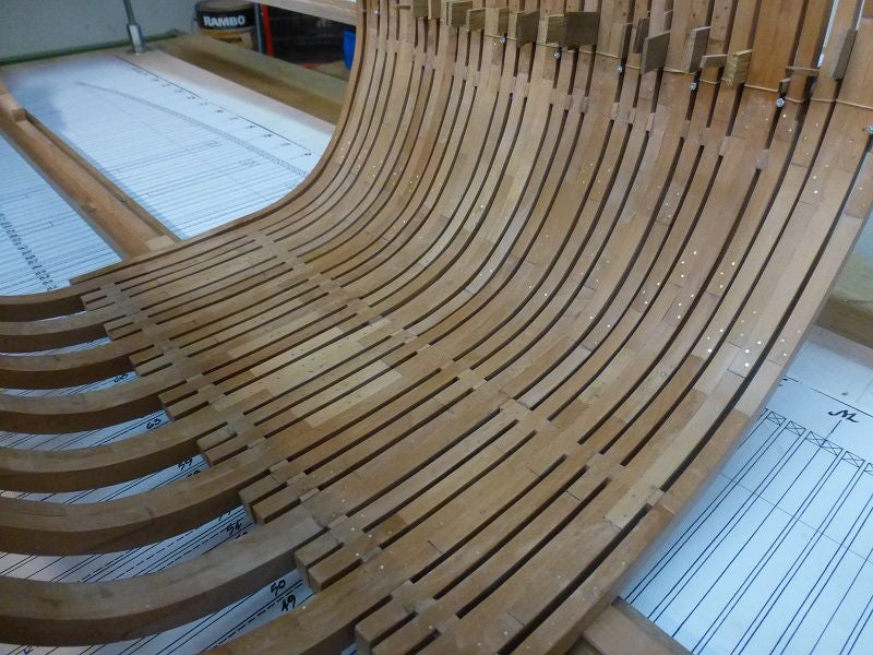 Vandaag flink aan de slag geweest. Na spant 41 en 43 is inmiddels ook spant 40 gereed. Spant 42 wordt op spant 41 gelijmd en deze schiet al aardig op. Eerst alles even laten drogen en aankomende week spant 41/42 afmaken. Daarna alles weer voorzien van penen en opschuren.