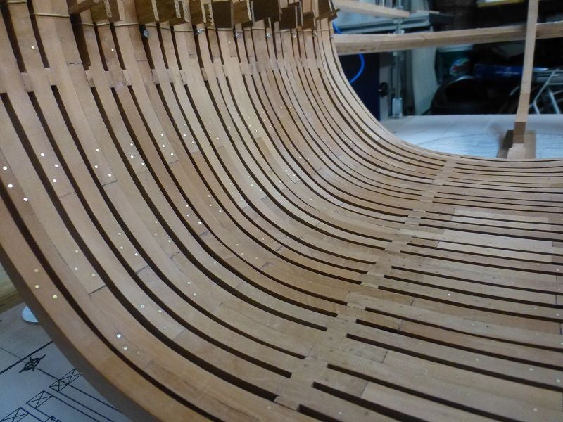 Vanmorgen de spanten tussen de onderste 2 tussenblokken geschuurd. Daar zit nu een vloeiende lijn in. Na de grijpvoorraden weer aangevuld te hebben ben ik begonnen om de rondingen uit te lijnen. Daar wordt nu ook een rij tussenblokken in gezet. Zodra deze er allemaal inzitten kunnen de rondingen inwendig geschuurd worden. Mooi vulwerkje tijdens het vervaardigen van de vitrinekast voor de Vic 1:72. Deze week kan ik het hout van de kast ophalen.