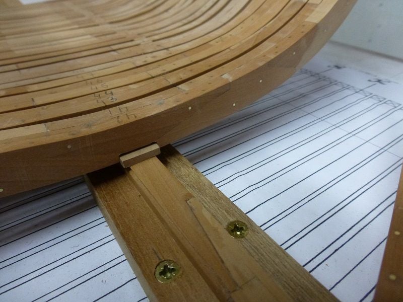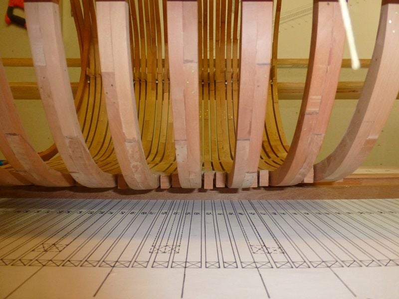 Intussen heb ik alle spanten in de ronding op elkaar proberen af te stemmen. Helaas lukt dat niet door alleen de spanten met een touw vast te spanten aan het bovenste blad van de mal. Dus toch nog maar eens in de foto's van Alexandru gezocht of ik daar iets kon vinden. Nu heeft hij, in de beginfase, vooral foto's gemaakt van de onderzijde van de frames en toevallig kwam ik een foto tegen waarin ik zag dat hij ook in de zijbenen van de spanten afstandblokken heeft aangebracht.