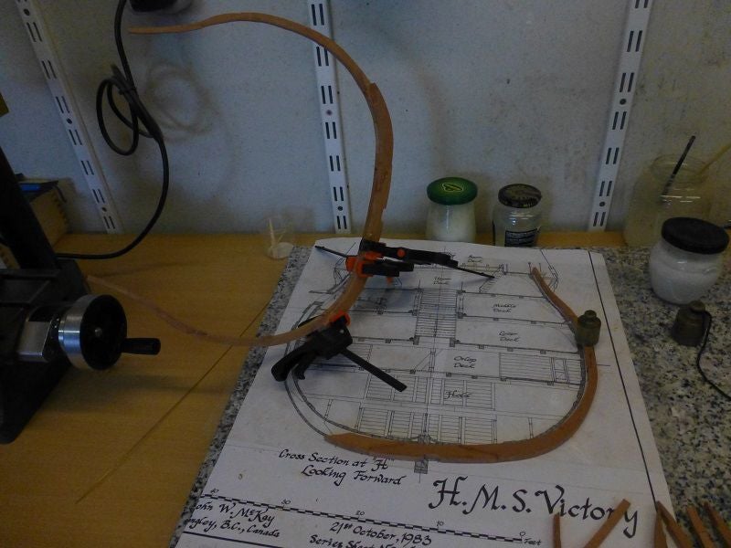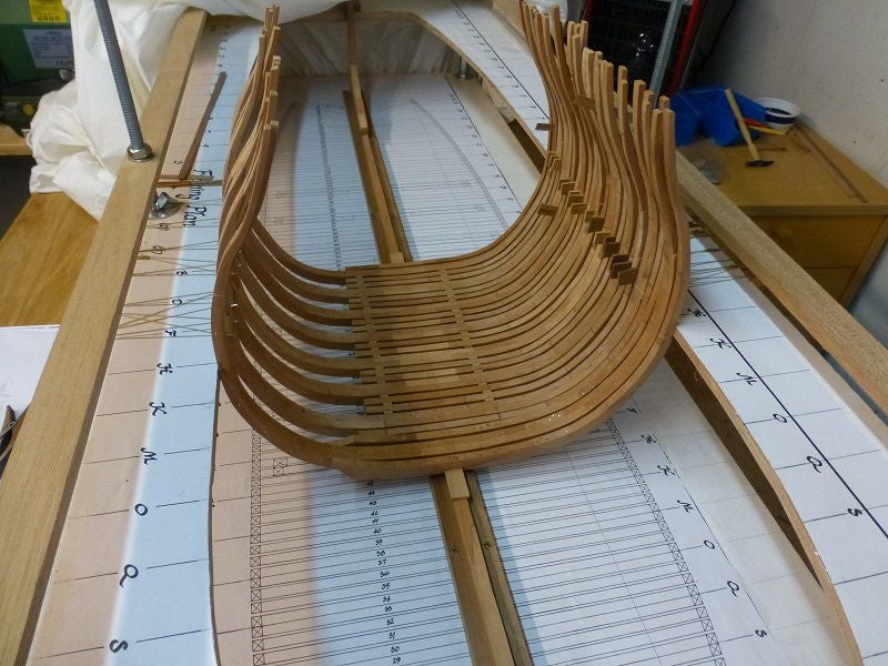 De spanten van sectie K zijn gereed. Tijd om ze weer vast te zetten op de kiel. Aankomend weekend eerst wat hout gereed maken voor de bovenste kielplank en daarnaast wat extra hout voor de afstandblokken. Even de grijpvoorraden weer opvullen. Ondertussen sectie M maar vast voorbereiden