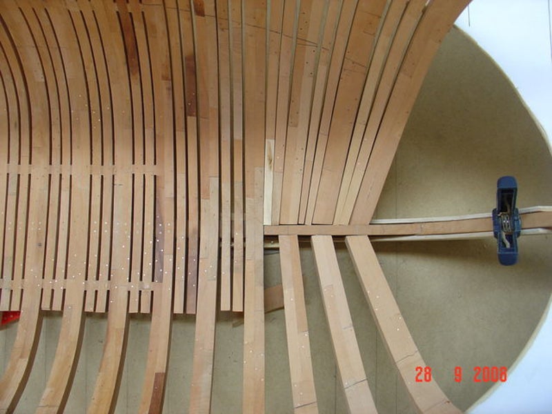 Afgelopen week toch maar bezig geweest met het aanbrengen van de tussenblokken boven de onderste ronding van de romp. Aankomend weekend krijg ik namelijk controle uit het zuiden, mijn backoffice komt langs.