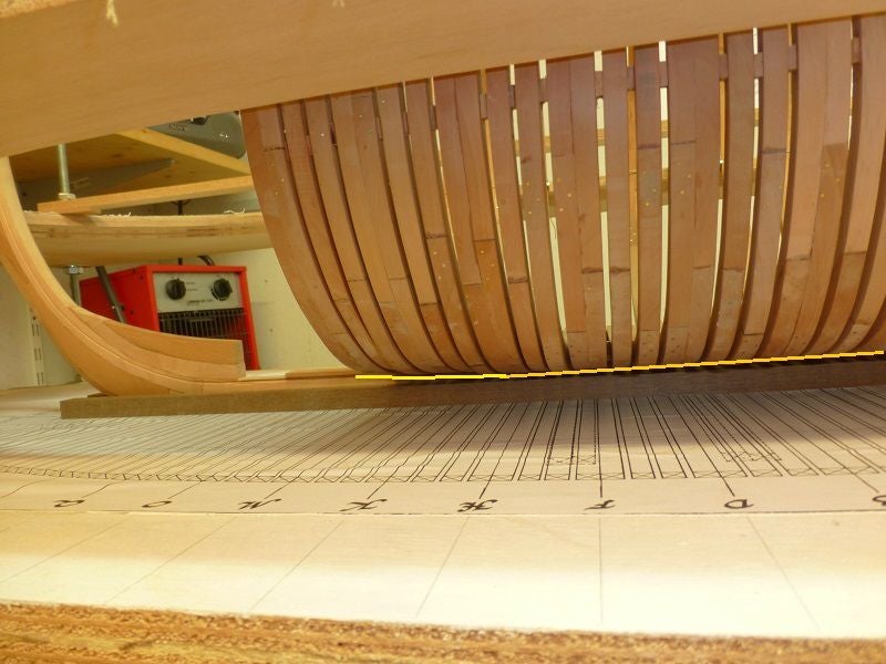 Naast het feit dat de spanten aan de onderzijde vanaf nu steeds dikker worden, draaien ze ook met de boeg mee. Ik heb even twee foto's gemaakt om dit zichtbaar te maken. Dit betekent dat ik nu spant voor spant apart moet gaan maken en deze direct in de flow van de romp moet zetten. Eerlijk gezegd is dit werk wel leuker om te doen.