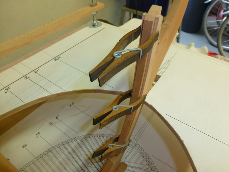 Het produceren van de vulspanten was geen eenvoudige klus. Ze lopen rond, taps en schuin... alles zit er in. Ik heb ze tijdelijk even met een paar knijpers, dry fit, op de boeg gezet. Zodra spant 1 gereed is, zet ik alles in één keer vast.