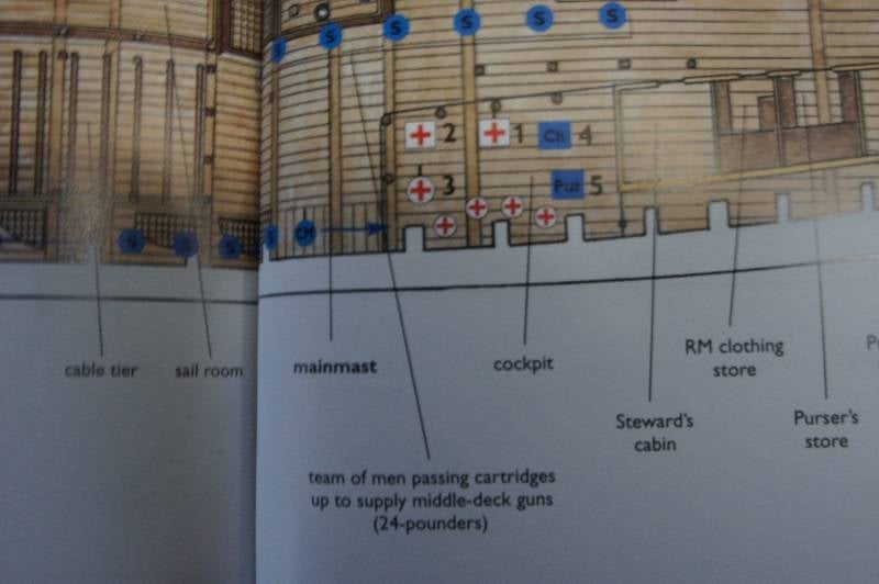 Het boek 'The Trafagal Companion' geeft uiteindelijk de juiste functie aan van deze ruimte. Zover ik nu kan beoordelen konden, ten tijde rond een zeelslag, tussen deze ronde palen wanden geplaatst worden. In het boek wordt aangegeven dat in deze ruimte 2 Surgeon's(1 en 2), een Assistan Surgeon(3), een Chaplain(4) en een Purser(5) aanwezig waren. De namen van deze mensen staan zelfs aangegeven in het boek. Daarnaast werden zij ondersteund door 4 Loblolly Boys.