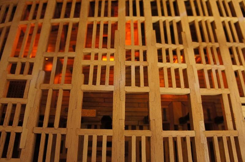 De dekconstructie boven de Cable Tier en de Sailroom is bijna gereed. Er is nog een extra lamp geplaatst achter de afscheiding. Bij de volgende dekbalk zijn beide gereed. De draadboom voor het elektra is naar achteren en ook direct naar het Lower Deck aangelegd. Ik ga dus nu aan 'The Pump Room' beginnen en daar viel mij 'The Midshipsman Berth' op. Op mijn tekeningen staan wanden aangegeven, op andere tekeningen en in diverse boeken worden alleen de ronde palen aangegeven.