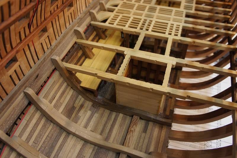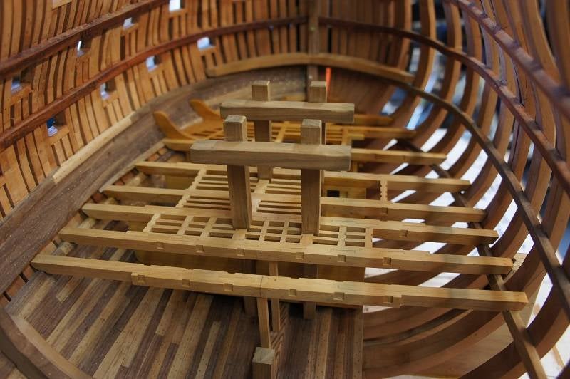 Het platform aan de zijkant van het hoofdruim is geplaatst en de dekconstructie boven het voorste platform is gereed. Tussen de laatste 2 dekbalken zat nog een ingewikkeld werkje. Daar lopen de 'lodging knees' over elkaar heen, waardoor de voorste met een ronding naar beneden loopt. De drainagegoten zijn tot aan de hoofdmast afgedekt met planken. Ik heb er één bewust naast de goot geplaatst, zodat men kan zien hoe e.e.a. in elkaar zit.
