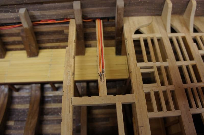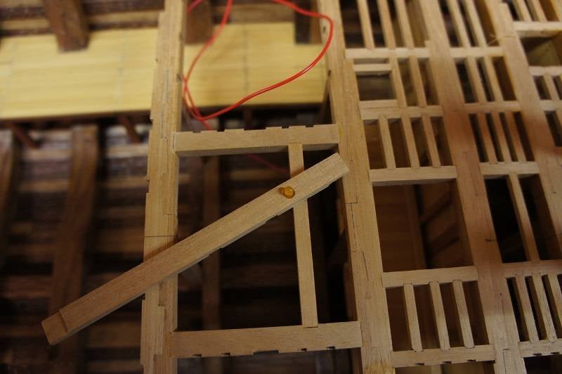 In het gat bij dekbalk 51 komt straks het Hanging Magazine en deze loopt onder de dekbalken door. Door in dekbalk 51 een lichtpunt te maken, zie je straks de lichtbron niet meer. Geen zorgen.... Er komen ook nog zichtbare lantaarns in het ruim te hangen, de benodigde materialen zijn besteld.