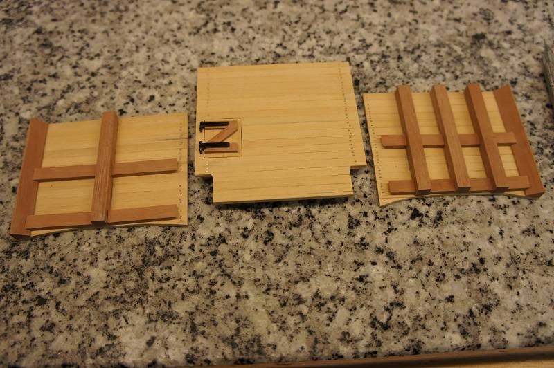 Ik werd daarbij direct geconfronteerd met het feit dat het platform op de tekeningen van John gedeeltelijk weer af wijkt van wat andere bouwers bouwen of gebouwd hebben. Zo zijn er nog meer kleinere afwijkingen. Ik ga er van uit dat de tekeningen van John de werkelijkheid weergeven van de periode voor 1805 en heb besloten geheel conform de tekeningen te bouwen. Zo heb ik een halfronde balk aan de voorzijde op het platform geplaatst en zijn de vierkante steunen onder het platform voor een deel rond.