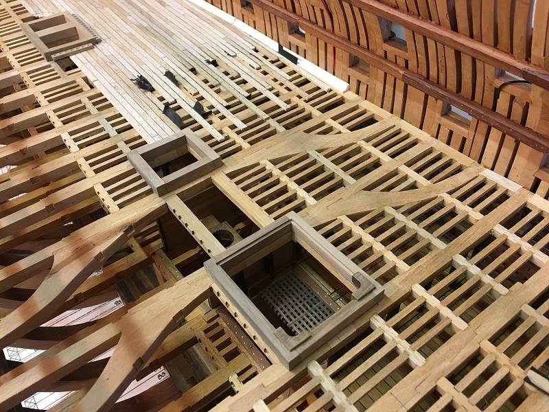 Het beplanken van het dek is nu dus gereed en ik ben inmiddels gestart met het beplanken van de romp aan de binnenzijde. Intussen ga ik ook aan de slag met de luiken, enz. We hebben vanmiddag besloten dat de kanonluiken, enz., ook aangebracht gaan worden. Er is dus veel werk te doen.