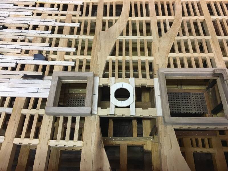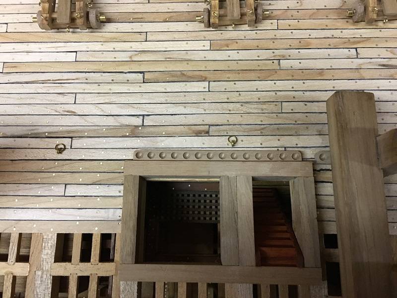 We hebben halverwege dit jaar al besloten dat de geschutspoorten voorzien worden van luiken. Dit worden werkende luiken, inclusief bedieningskabels, enz. Daarom zijn de binnenzijden van de geschutspoorten conform de tekeningen voorzien van afdekplanken. Om de planken netjes aan te laten sluiten met het hout aan de buitenzijde zijn de onderste en bovenste afdekplank gemaakt van 2 soorten hout. Op deze wijze blijven de kleuren hetzelfde.