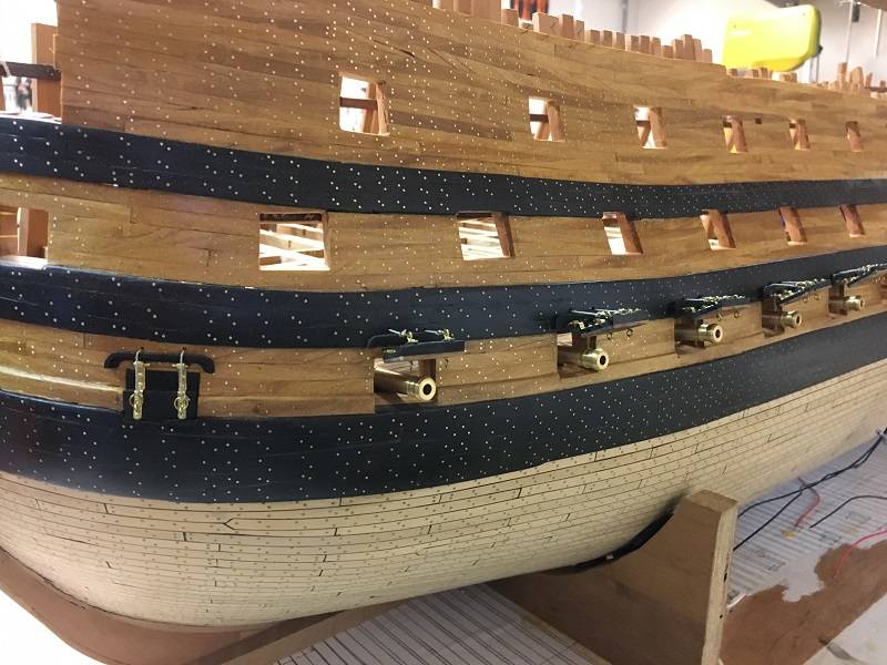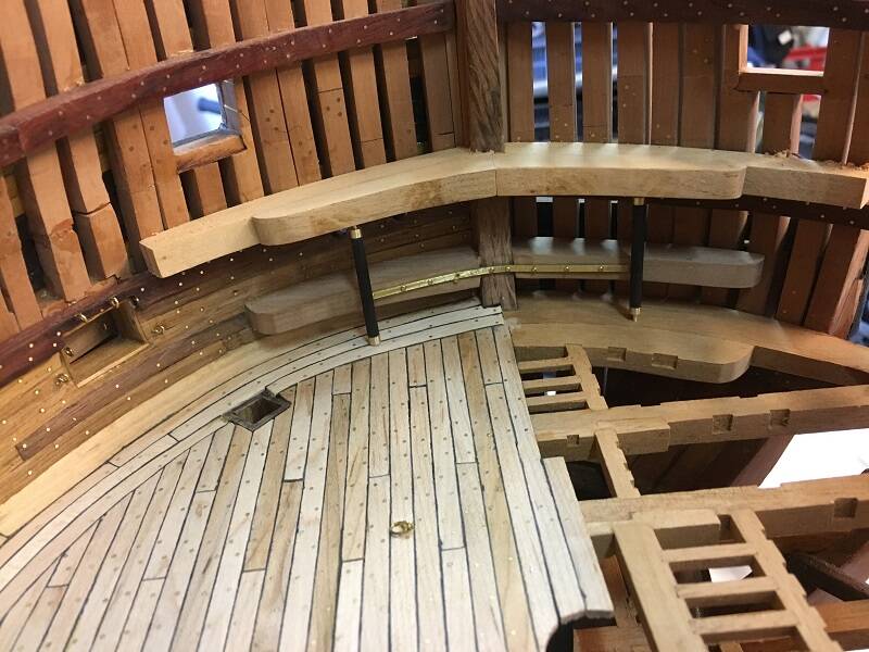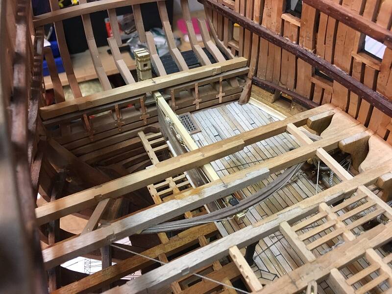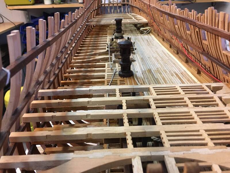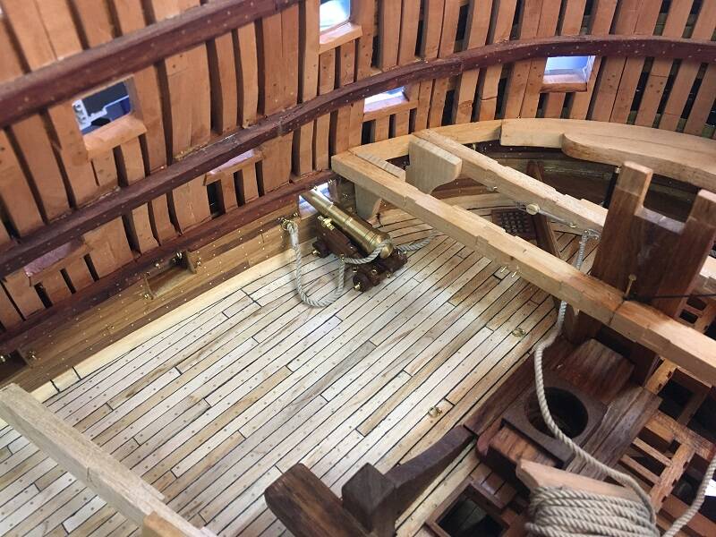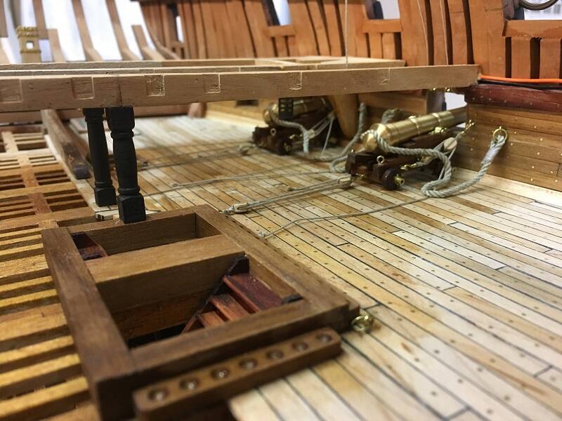 Het achterste gedeelte van het 'Lower Deck' is zo goed al klaar. Er staan inmiddels 4 van de 15 kanonnen, drie luiken zijn gereed, verankeringen zijn aangebracht en de 'rail stanchions' staan om het eerste trappengat. Ik heb nog niet alle verbindingsgangen tussen de dekbalken aangebracht. Ik wil namelijk de luiken nog wat beter kunnen afstellen en soms moet ik nog even bij een kanon kunnen om e.e.a. te beter te structureren. Als ik deze balken nu aanbreng, dan kan ik er bijna niet bij.