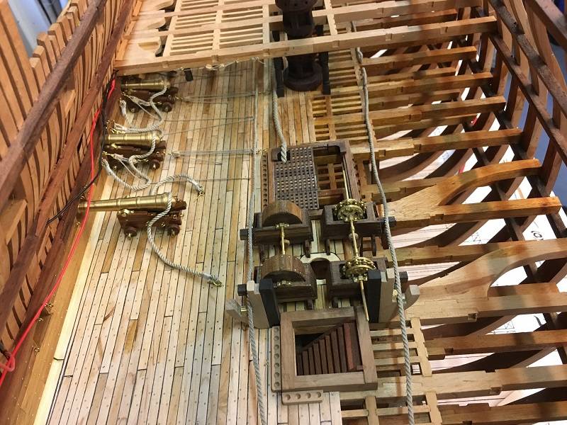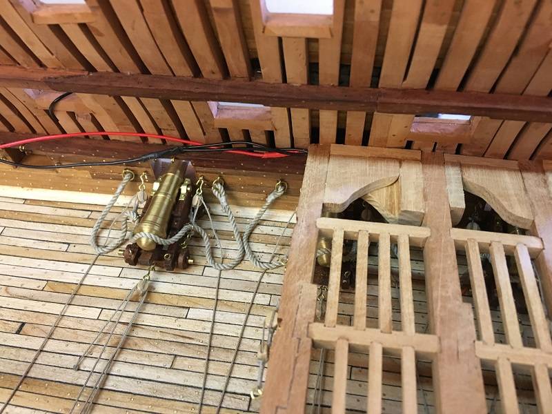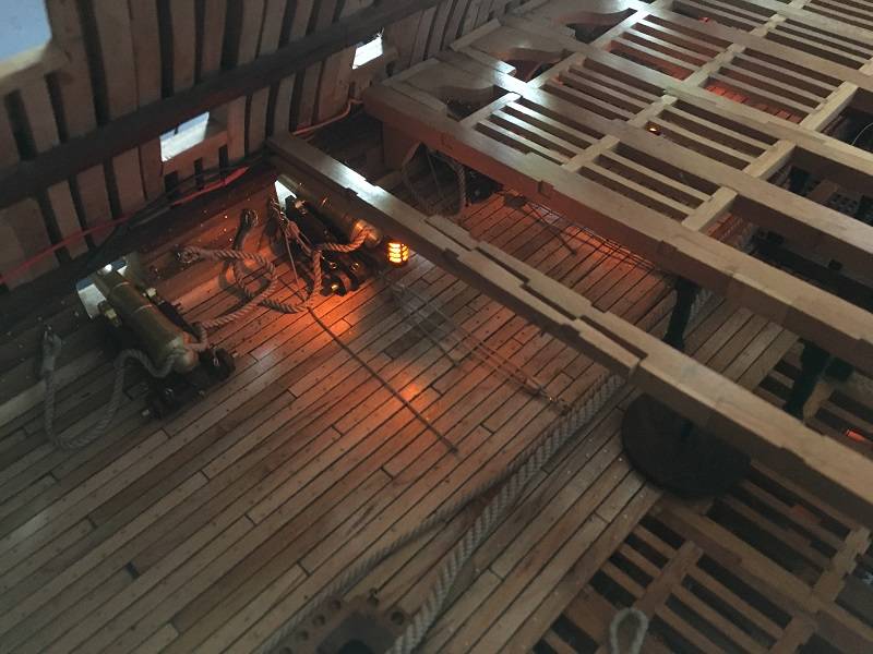 Het inrichten van het Lower Deck vordert gestaag. Het is nu een kwestie van kanonnen plaatsen en vastzetten. Inmiddels staan nu 8 van de 15 kanonnen. Het meeste werk zit hem in het maken van de takels en de bedieningen van de luiken. Daar ben ik gewoon 3 tot 4 avonden per week aan kwijt. Intussen is er ook weer een lantaarn opgehangen. Volgens het lichtplan komen er totaal 8 lantaarns op dit dek.