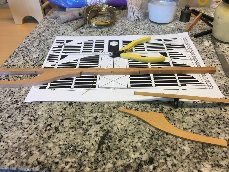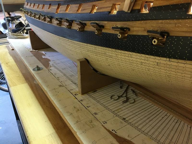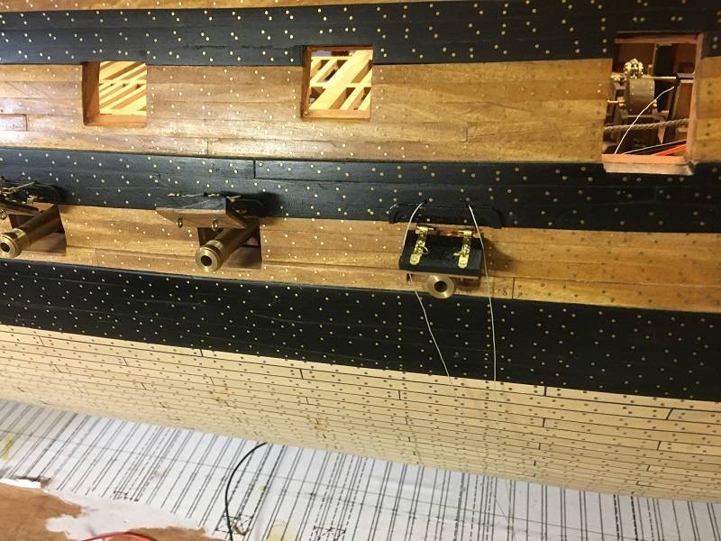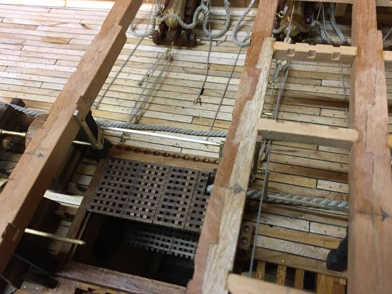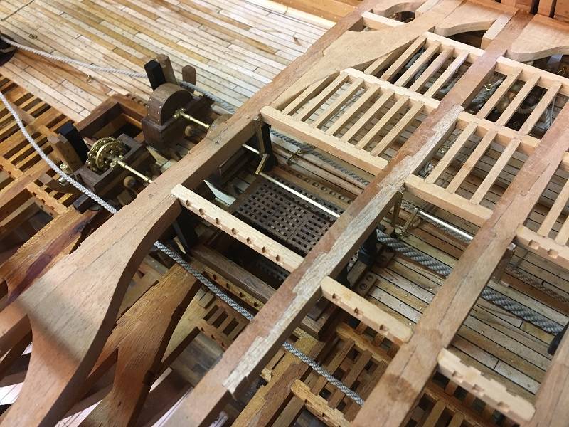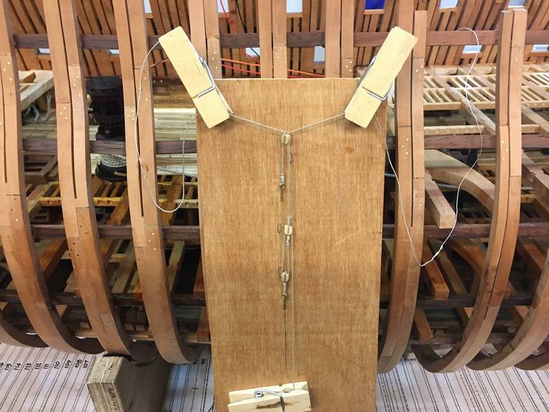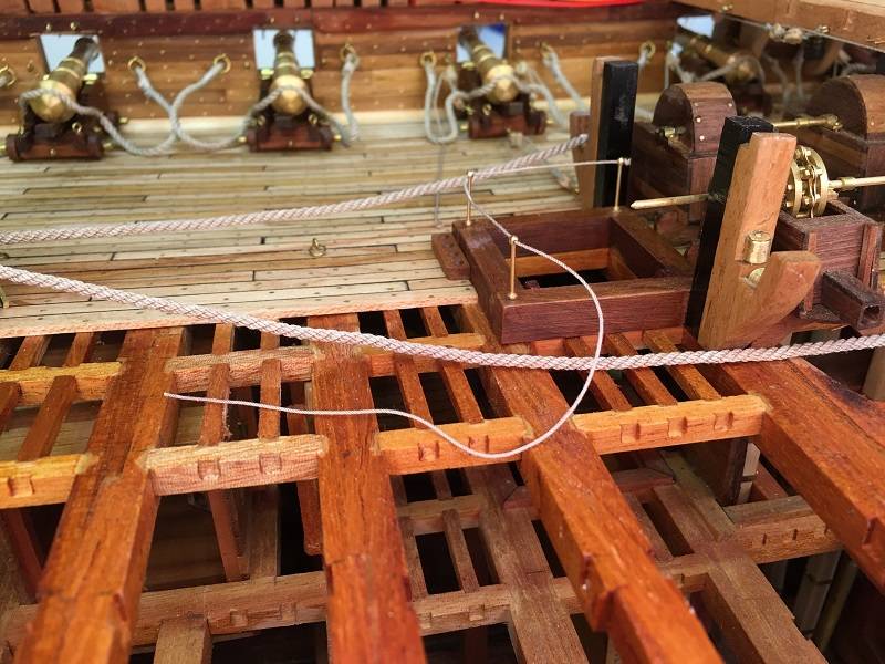 De bediening van de luiken moet, voordat de rest van de dekconstructie aangebracht wordt, ook aangebracht worden. Ik maak de bediening conform de echte bediening en gebruik daarbij 3 "Rigging Blocks". Als alle touwen gereed zijn, dan wordt de bediening in elkaar gezet op een mal en deze gaat naar de werkplaats. Ik verbind de touwen, die aan het luik bevestigd worden, eerst aan 2 touwen van 0,1 mm en trek daarna alles door de benodigde gaten heen. Daarna is het een kwestie van alles bevestigen, het luik afstellen en vastzetten. De bediening is altijd weer los te maken waardoor ik het luik iets hoger of lager kan zetten.