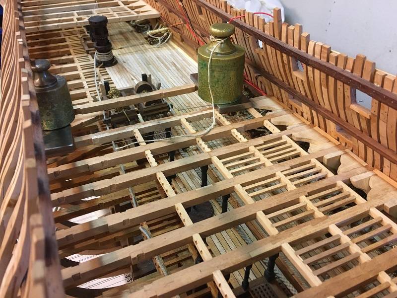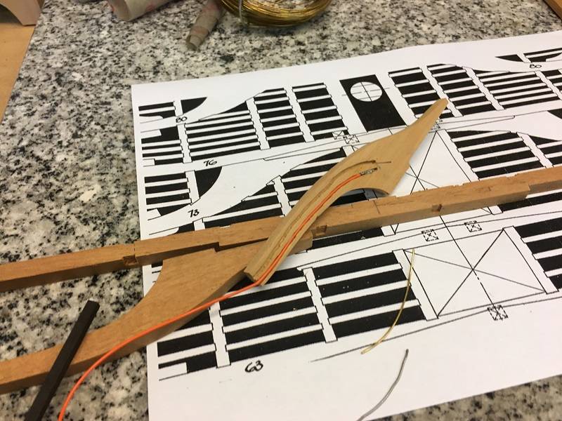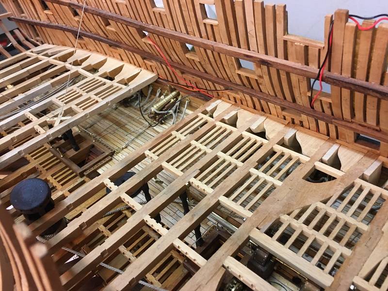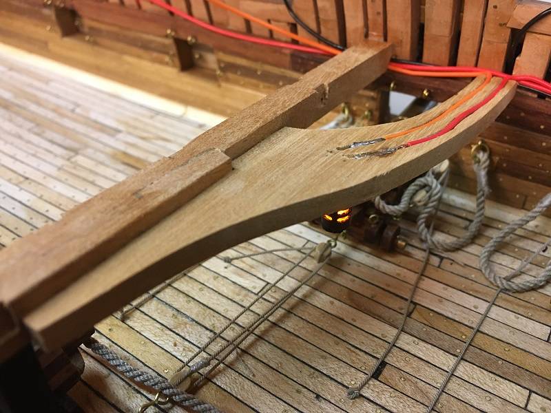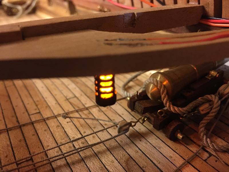 Intussen ben ik bij de sectie "Main Mast" gekomen waar dus ook alle pompen zitten. Uitgerekend in de dubbele spant moet een lantaarn komen en dat geeft aardig wat extra werk. De kabels worden weggewerkt tussen 2 halve dekbalken die uiteindelijk op elkaar worden gelijmd. Voordat de bovenste helft op de dekbalk wordt gelijmd, wordt de werking van de verlichting eerst even getest.