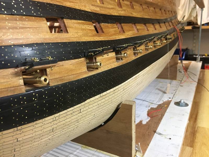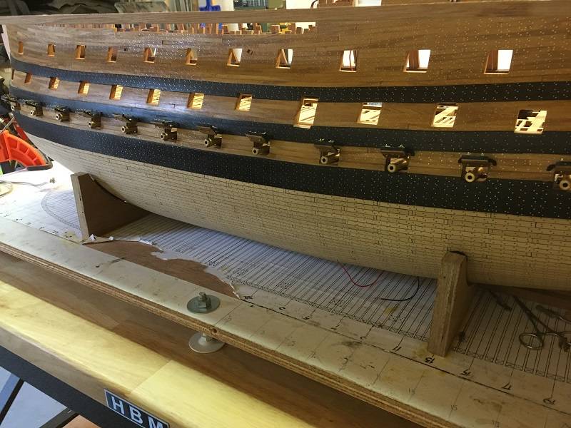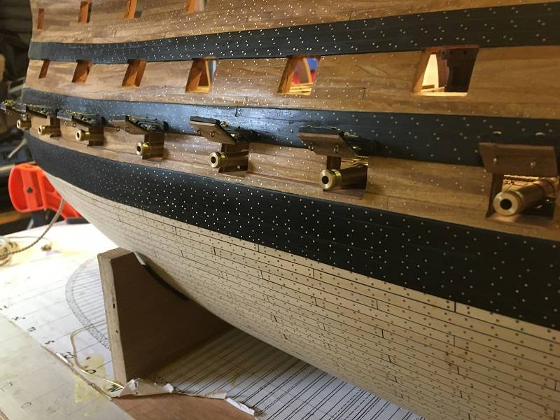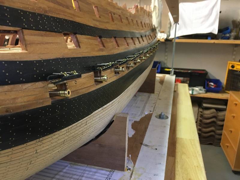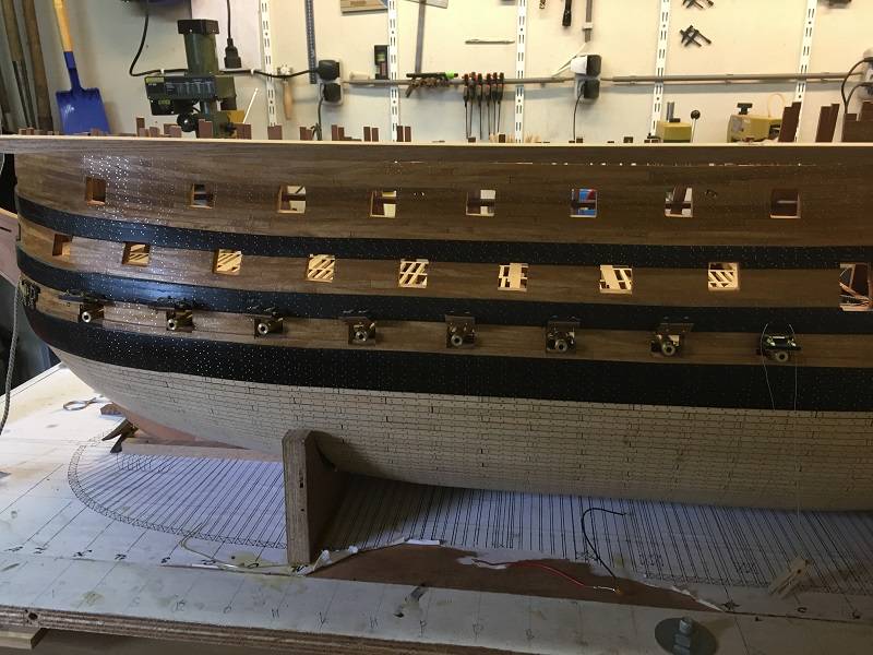 Ik moet nu nog drie kanonnen plaatsen en nog een stuk of 4 bedieningen van luiken maken en aanbrengen. Vic begint aan de buitenzijde al aardig imposant uit te zien met alle kanonnen in gevechtsstand.