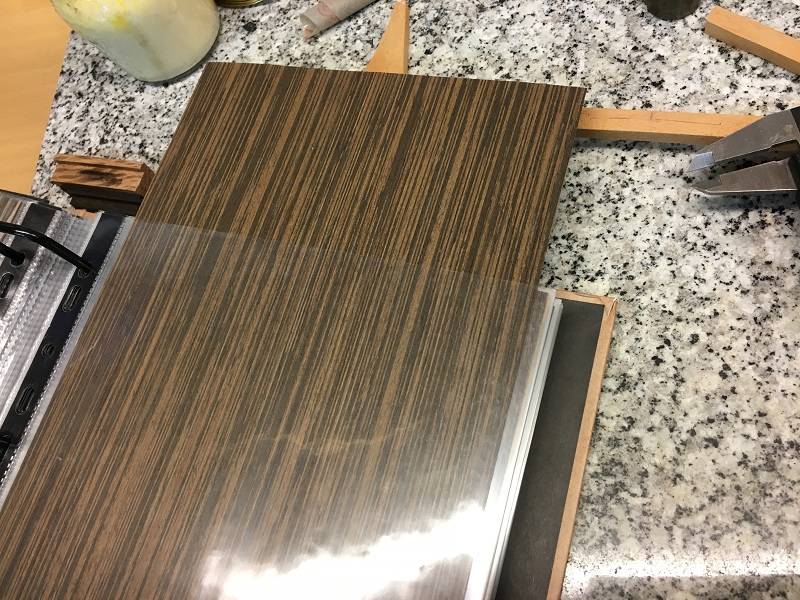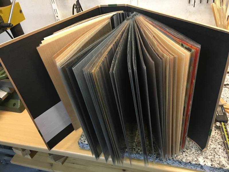 Soms moet je als modelbouwer ook wat geluk hebben. Mijn dochter en schoonzoon werken in de keukenbranche en omdat zij de showrooms opnieuw gingen inrichten, werden oude spullen weggegooid. Zo ook een boek met fineerbladen.... of ik die wilde hebben.. wat denk je.