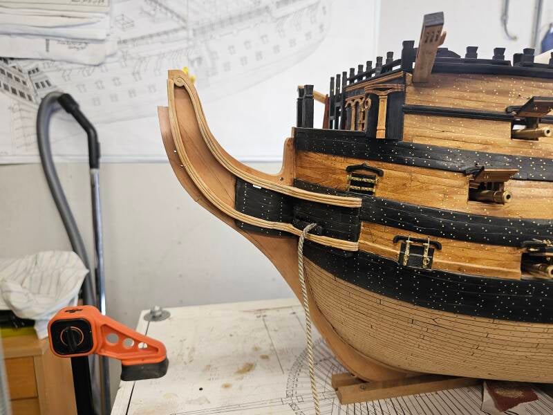 Daarna was het een kwestie van steeds meer verfijnen en schuren. Uiteindelijk is de Upper Cheek aan de dichte rompzijde voorzien van de benodigde groeven. Inmiddels zijn ze geplaatst op de boeg en gaan we weer rustig verder.