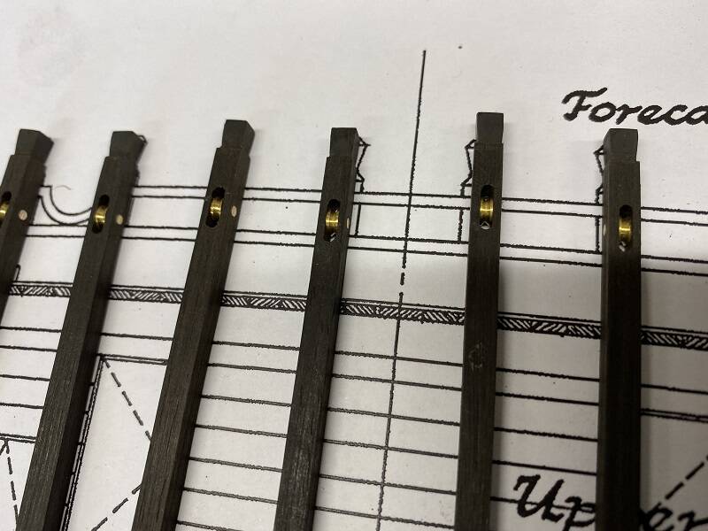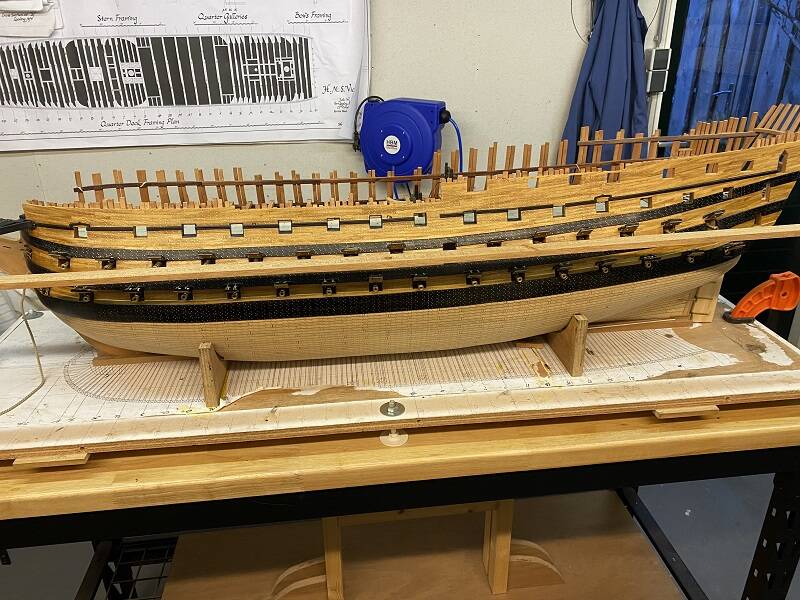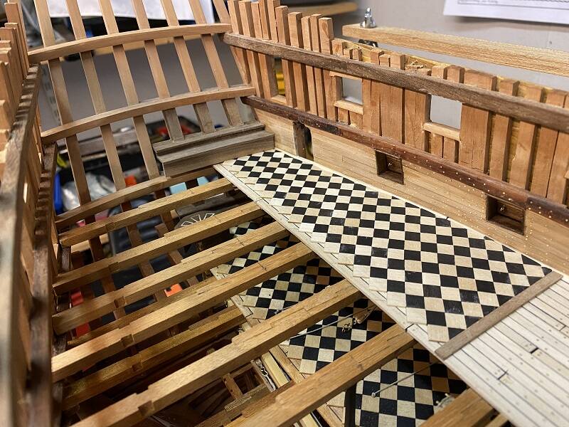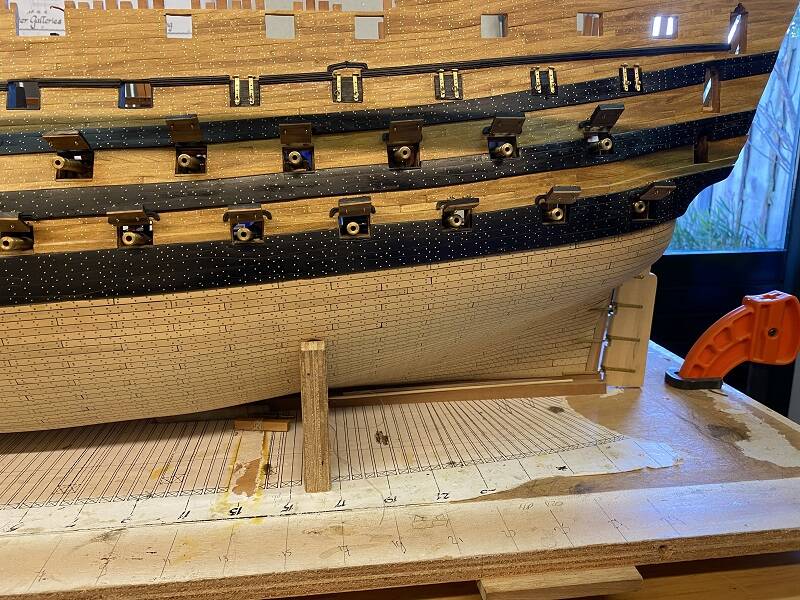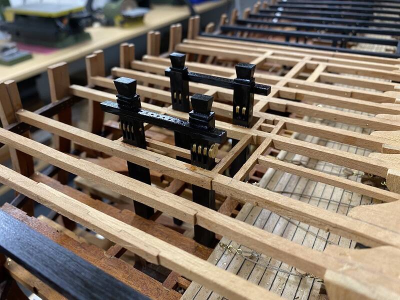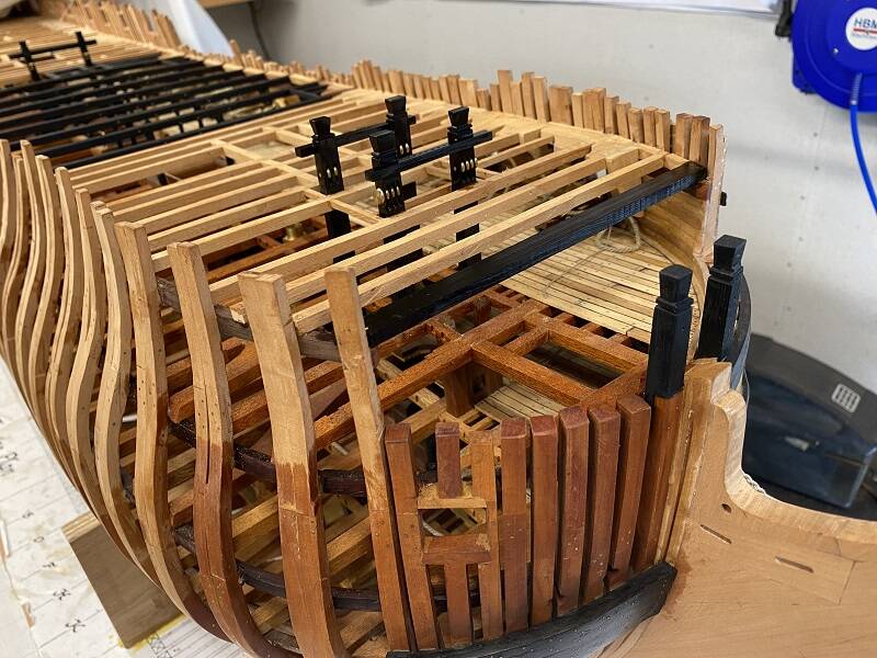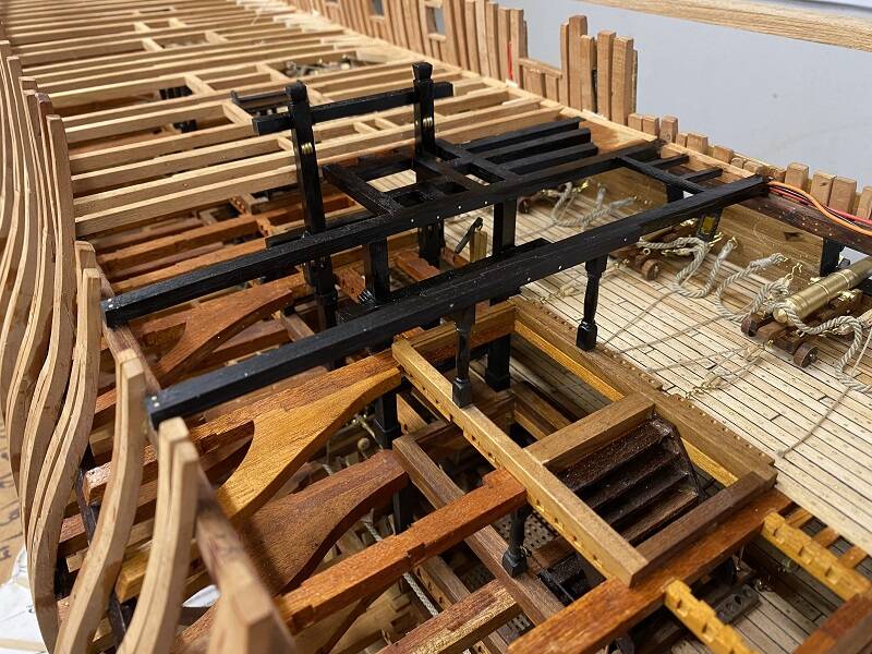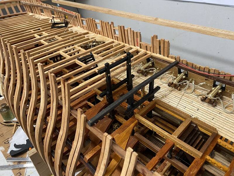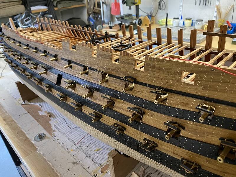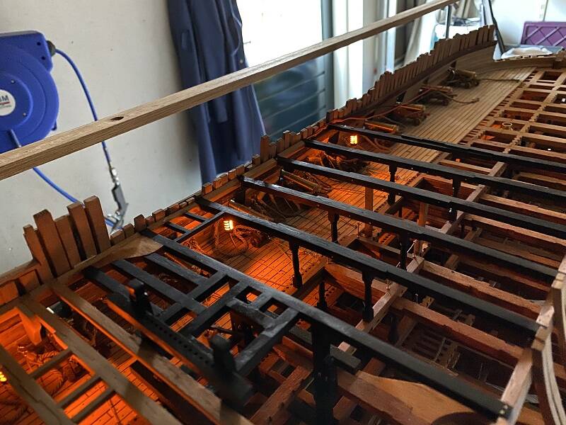 Ik heb flink wat kunnen bouwen en inmiddels zijn alle 'Guns' op het "Upper Deck" geplaatst, de bedieningen van de luiken aangebracht en zijn alle dekbalken van het "Quarter Deck" aangebracht. Alle lantaarns, 8 stuks, hangen aan de dekbalken en de elektradraden zijn weggewerkt.